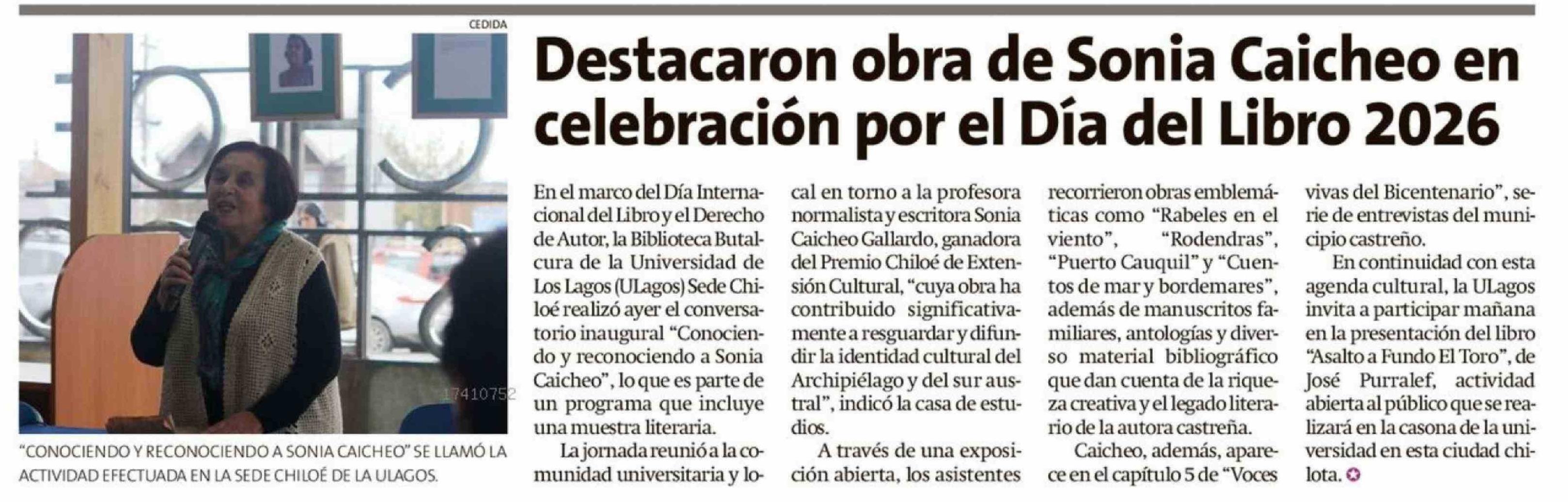 Título: Destacaron obra de Sonia Caicheo en celebración por el Día del Libro 2026
