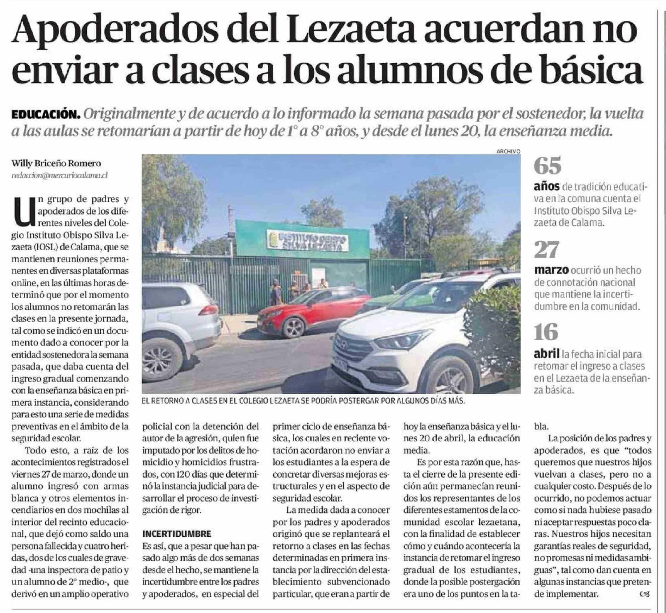Apoderados del Lezaeta acuerdan no enviar a clases a los alumnos de básica 16-04-2026 El Mercurio de Calama |