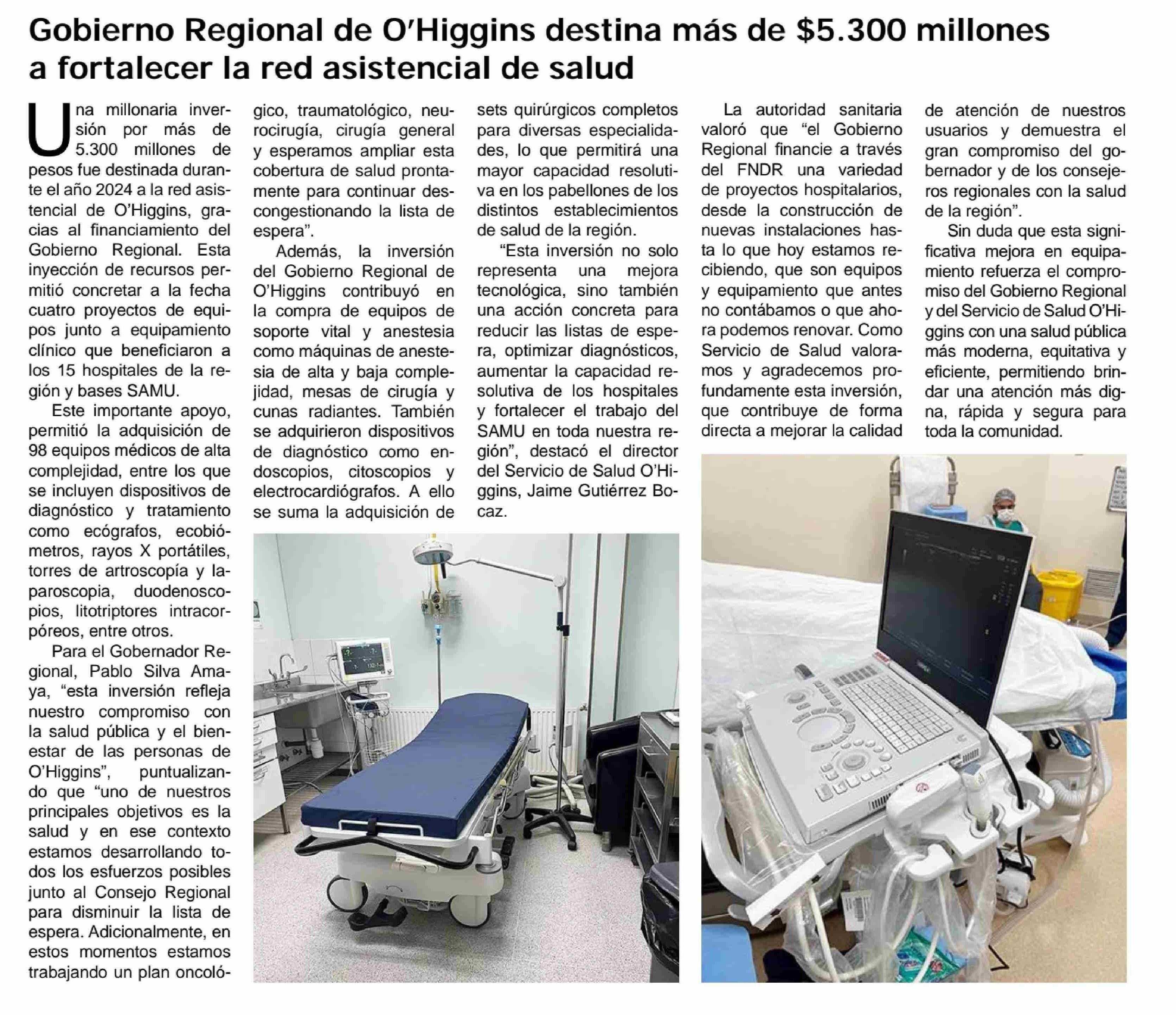 Gobierno Regional de O’Higgins destina más de $5.300 millones a fortalecer la red asistencial de salud 14-06-2025 Diario El Cóndor |