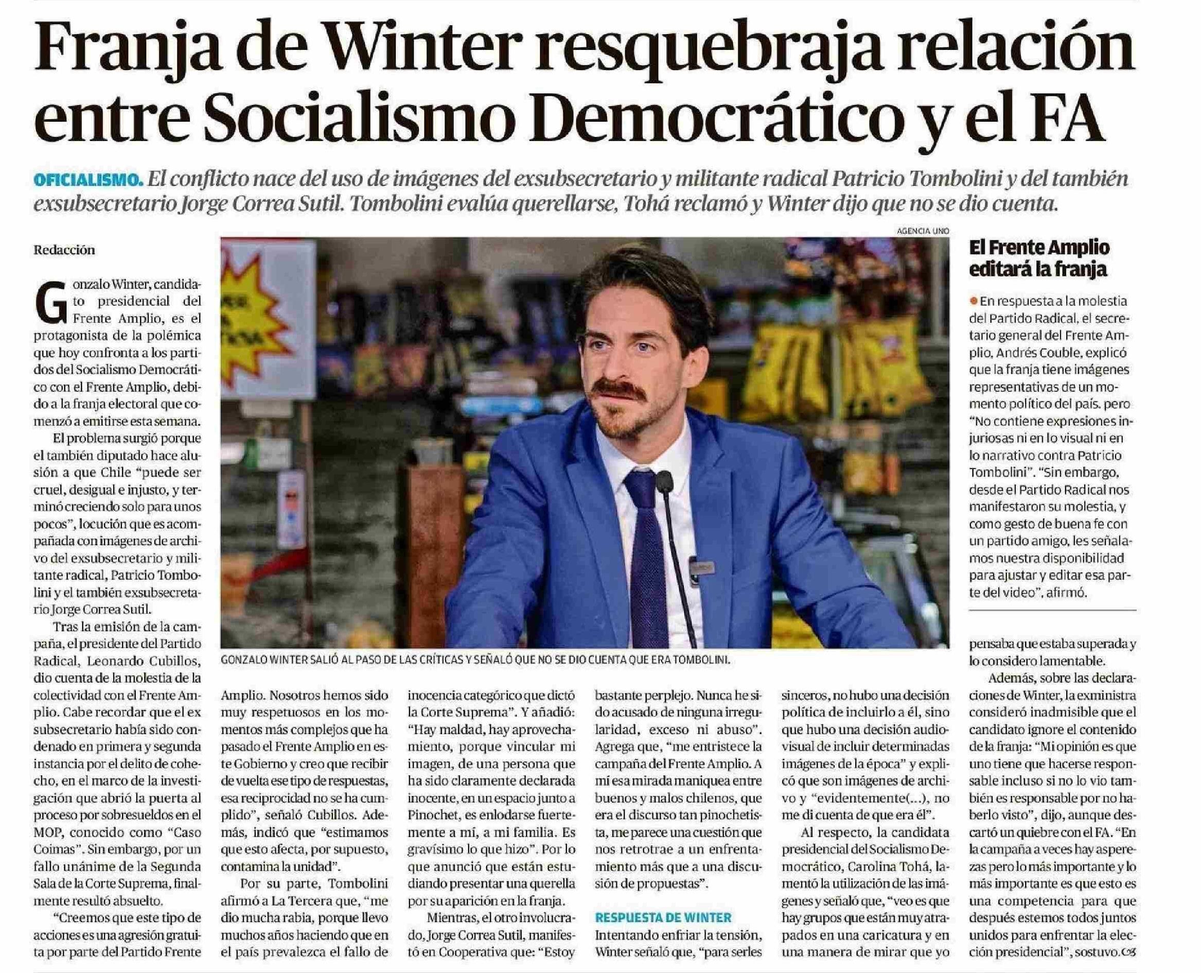 Franja de Winter resquebraja relación entre Socialismo Democrático y el FA 14-06-2025 El Austral de Osorno |