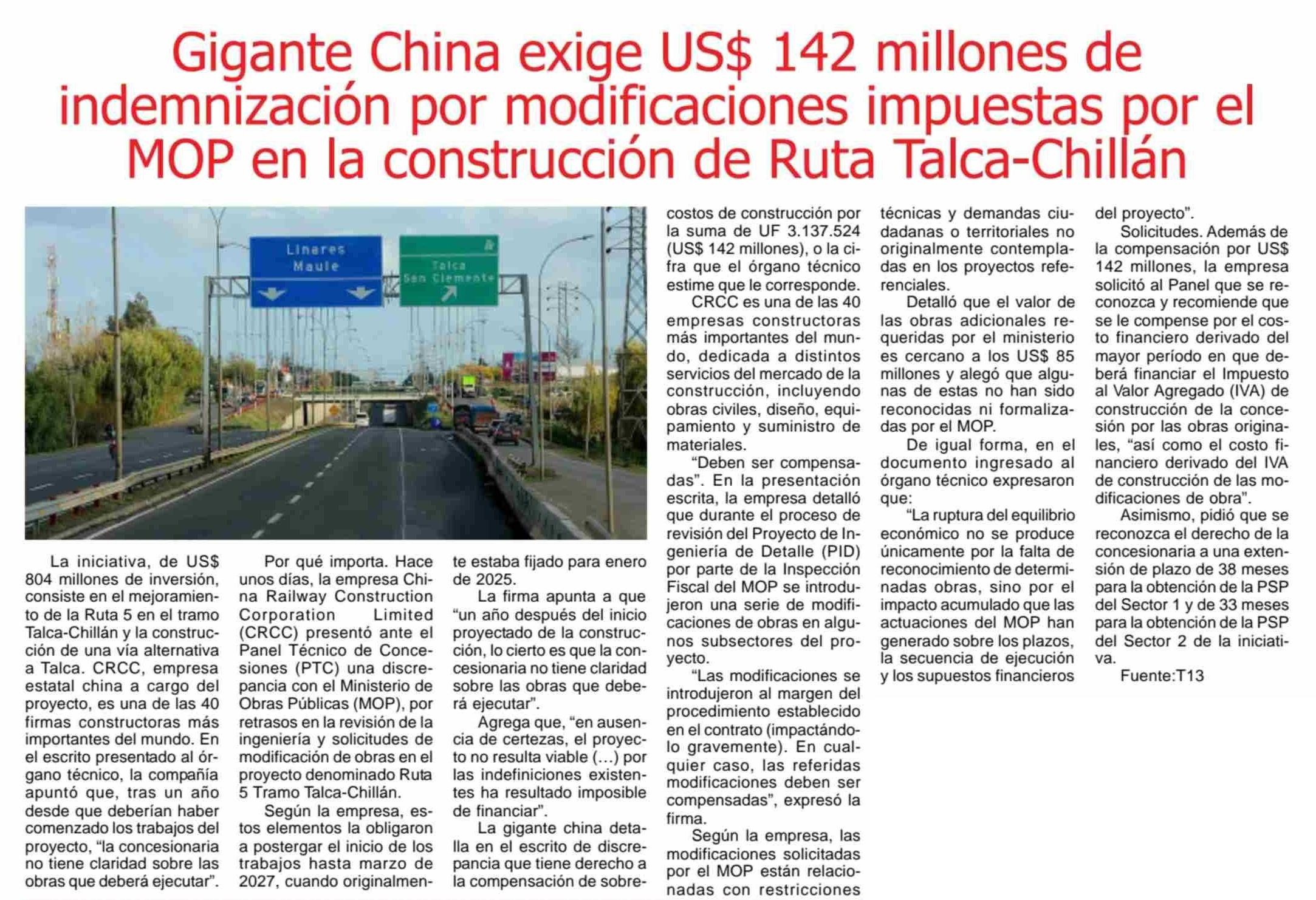 | Título: | Gigante China exige US$ 142 millones de indemnización por modificaciones impuestas por el MOP en la construcción de Ruta Talca-Chillán |
