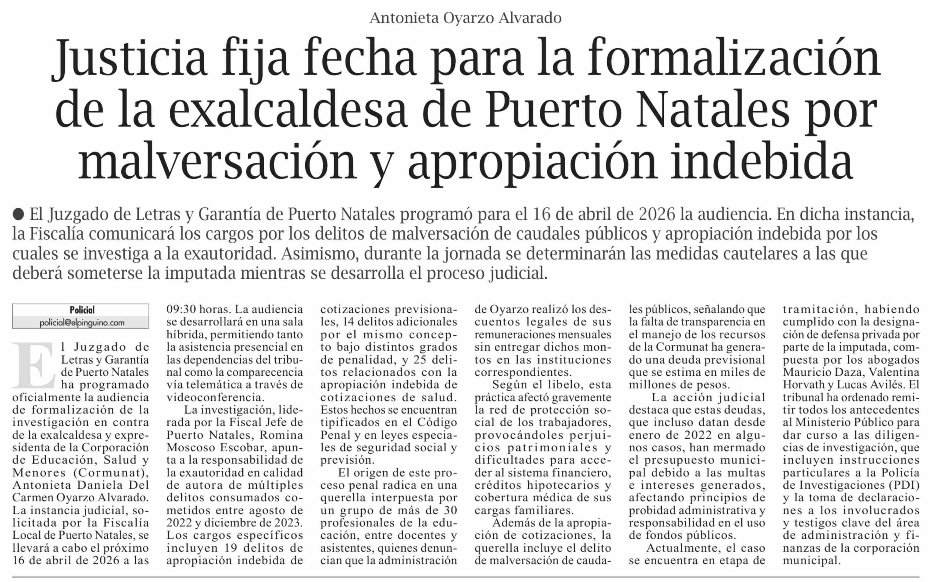 Justicia fija fecha para la formalización de la exalcaldesa de Puerto Natales por malversación y apropiación indebida 16-02-2026 El Pingüino |