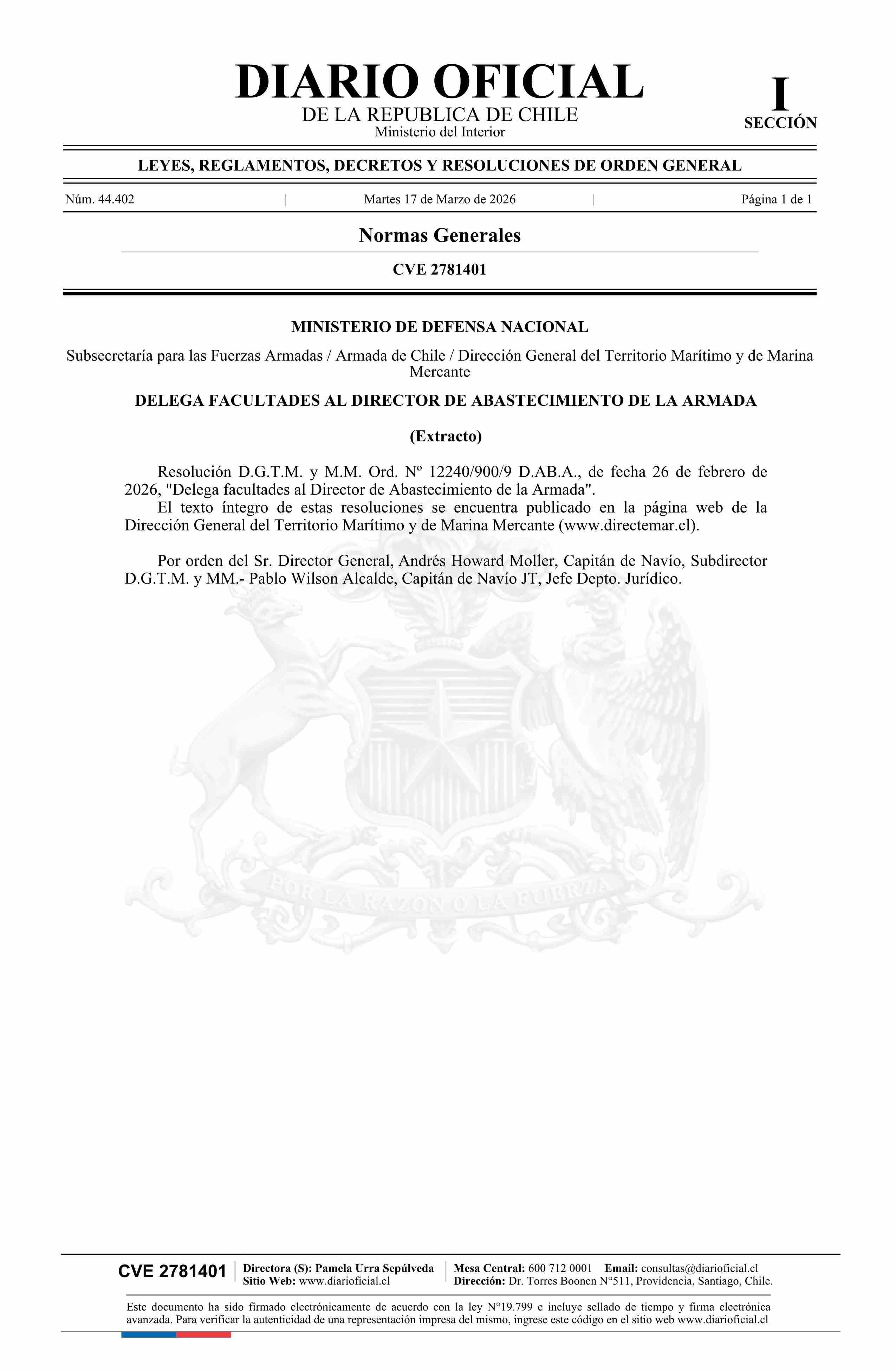Extracto de resolución número 12240/900/9, de 2026.- Delega facultades al Director de Abastecimiento de la Armada 17-03-2026 Diario Oficial Edición Electrónica |