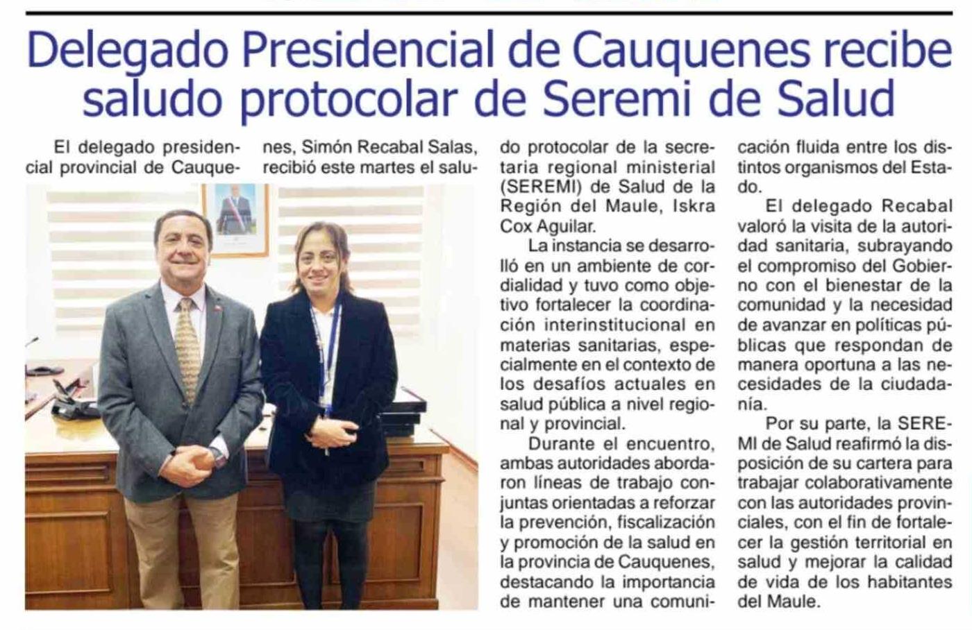 Delegado Presidencial de Cauquenes recibe saludo protocolar de Seremi de Salud 16-04-2026 Maule Hoy |
