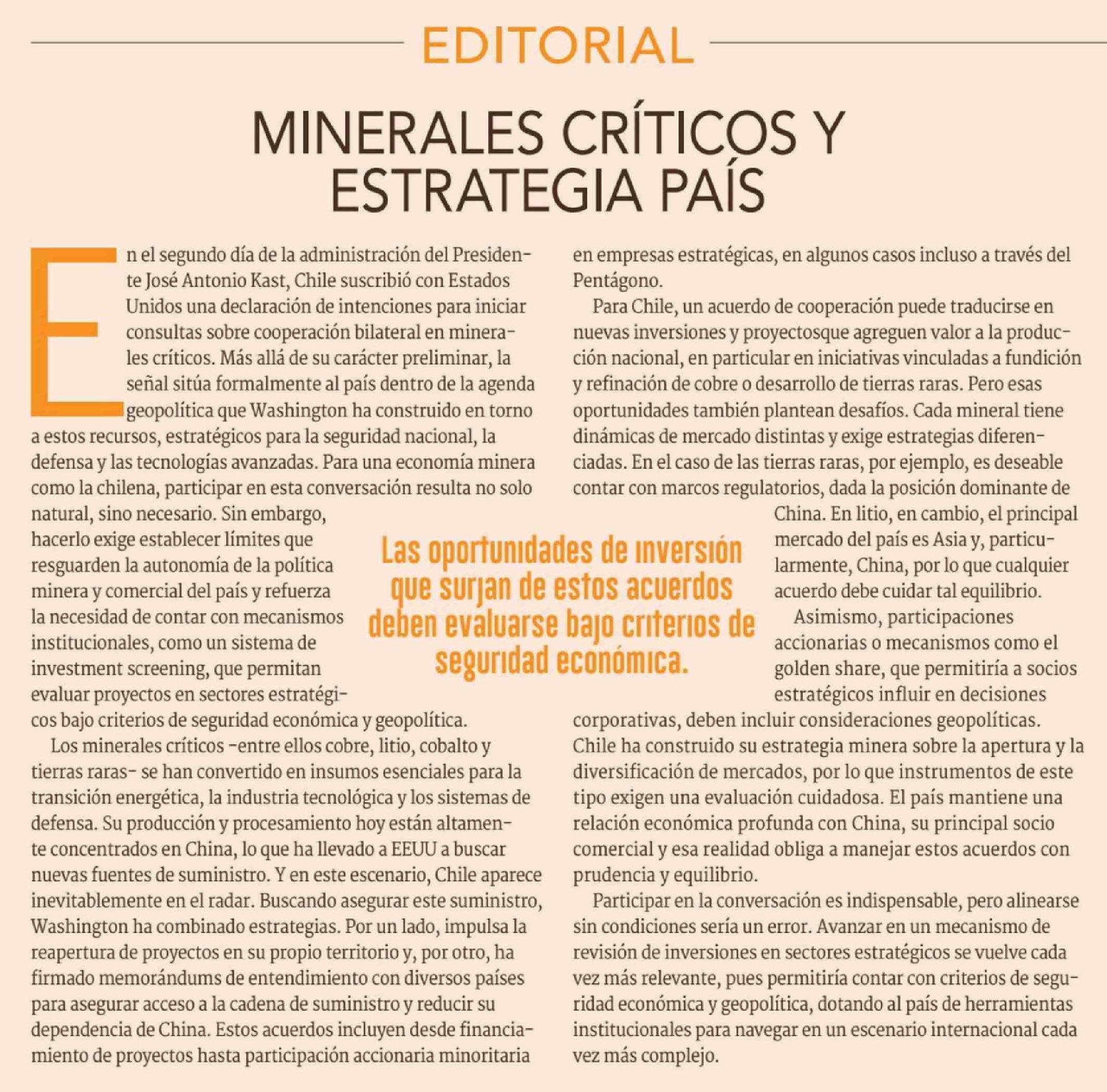 Editorial: MINERALES CRÍTICOS Y ESTRATEGIA PAÍS 17-03-2026 Diario Financiero |