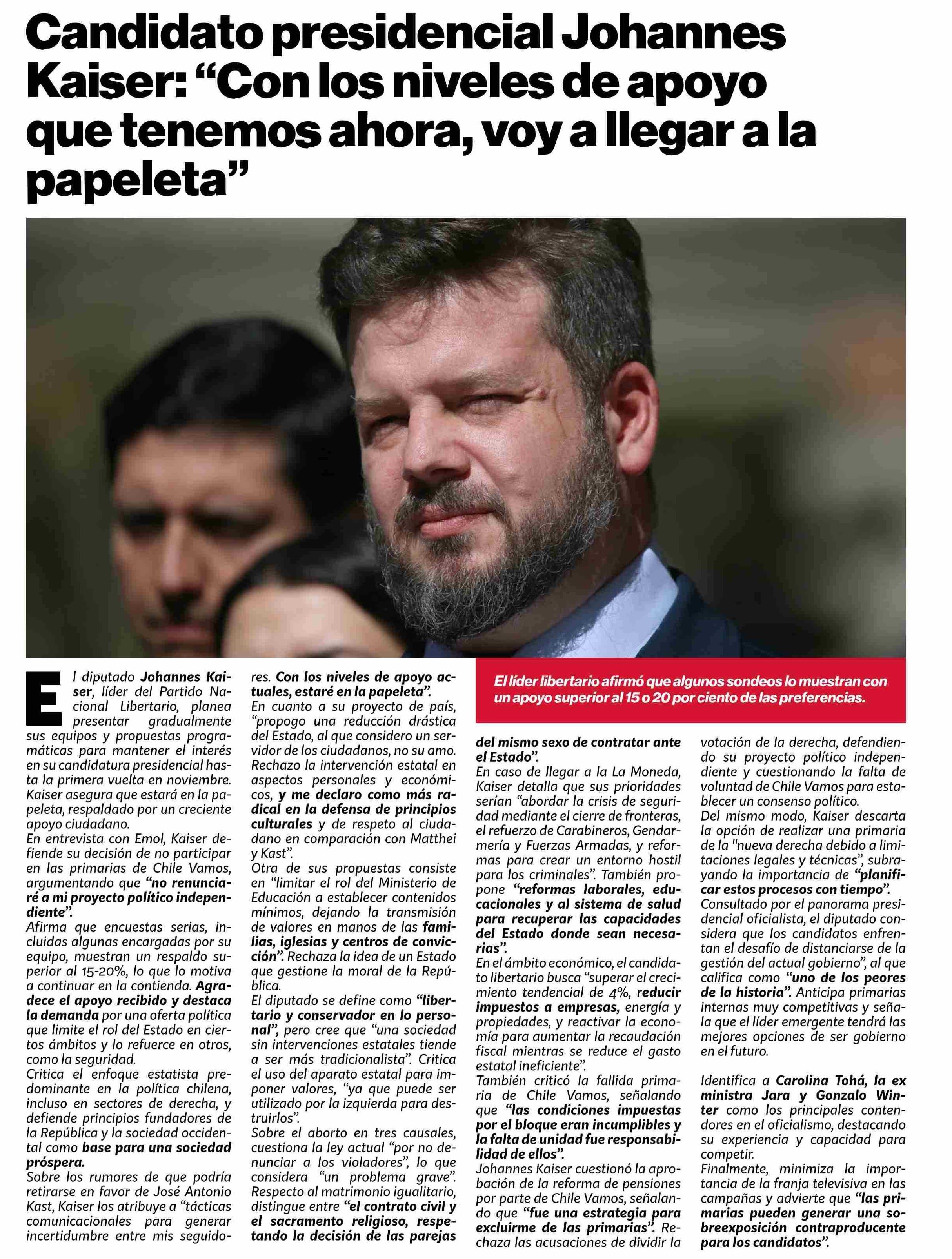 | Título: | Candidato presidencial Johannes Kaiser: “Con los niveles de apoyo que tenemos ahora, voy a llegar a la papeleta” |