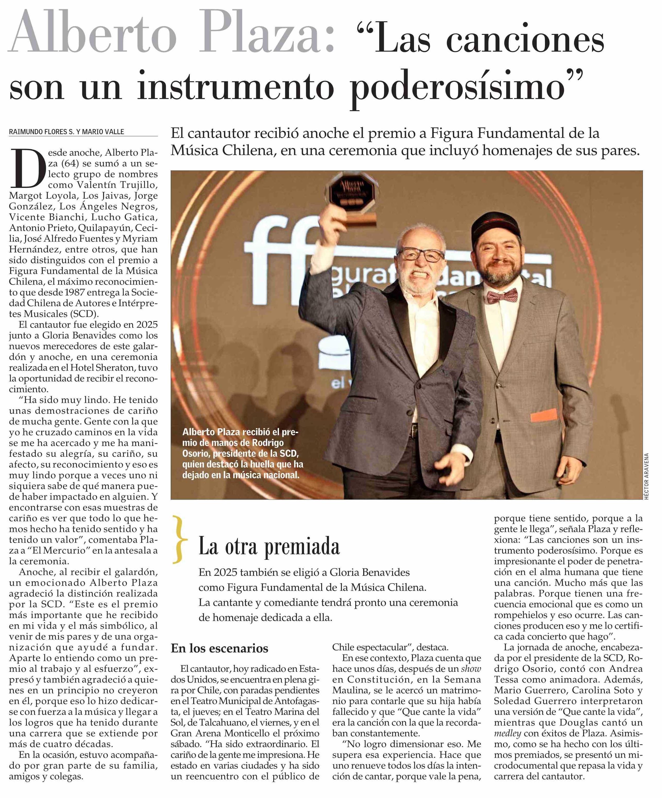 Alberto Plaza: “Las canciones son un instrumento poderosísimo” 03-03-2026 El Mercurio |