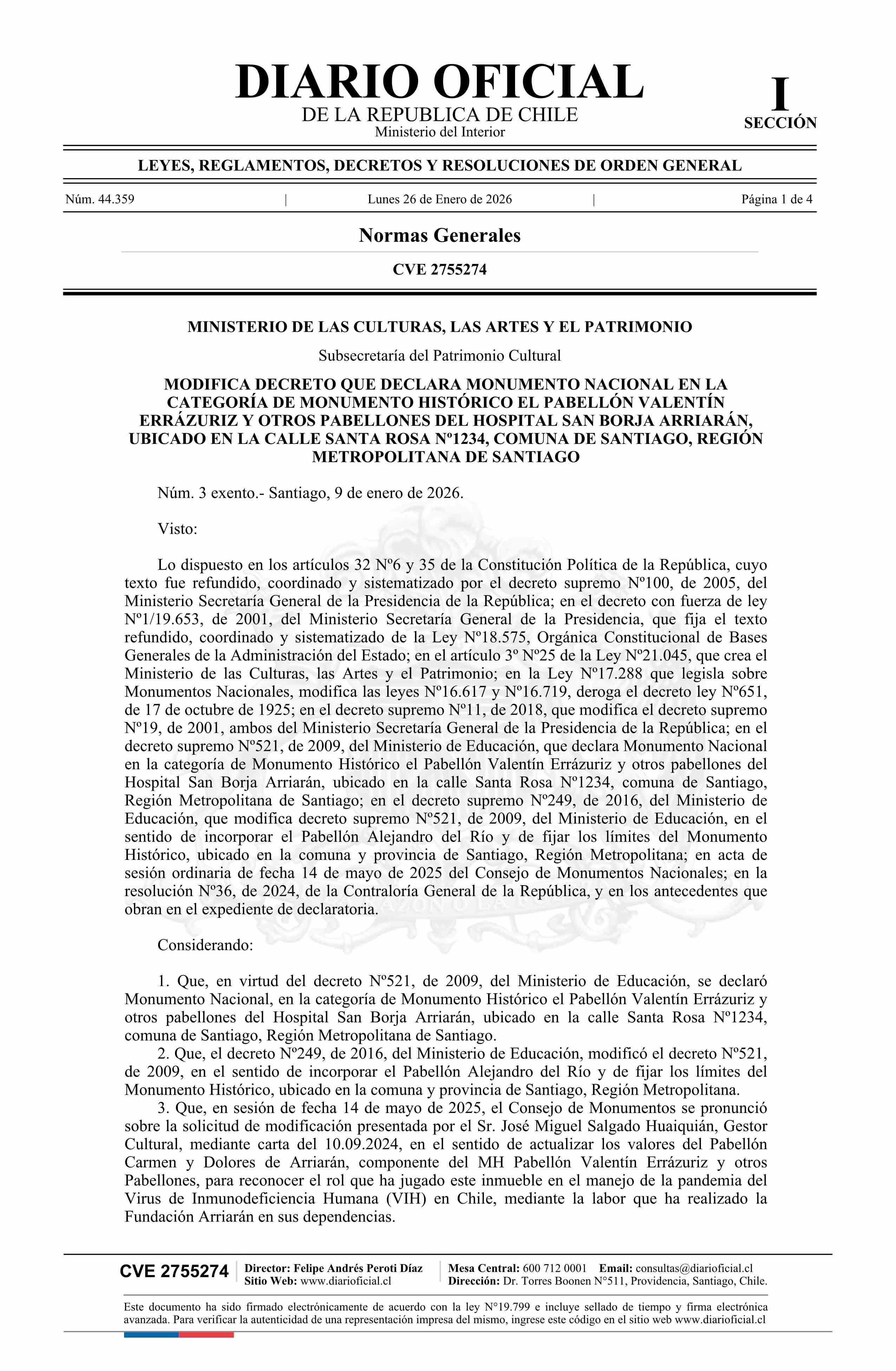 | Título: | Decreto exento número 3, de 2026.- Modifica decreto N° 521, de 2009, que declara monumento nacional en la categoría de Monumento Histórico El Pabellón Valentín Errázuriz y otros pabellones del Hospital San Borja Arriarán, comuna de Santiago, Región Metropolitana de Santiago |