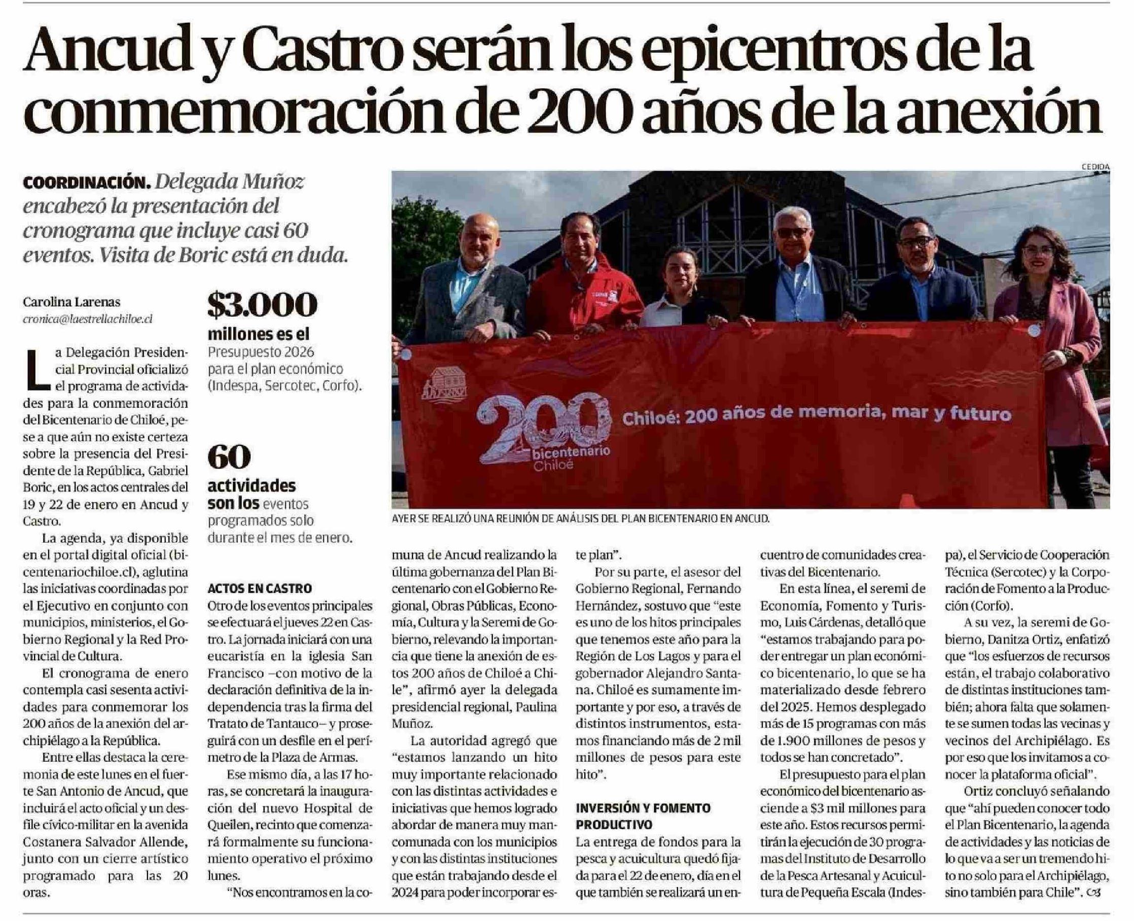 Ancud y Castro serán los epicentros de la conmemoración de 200 años de la anexión 16-01-2026 El Llanquihue |