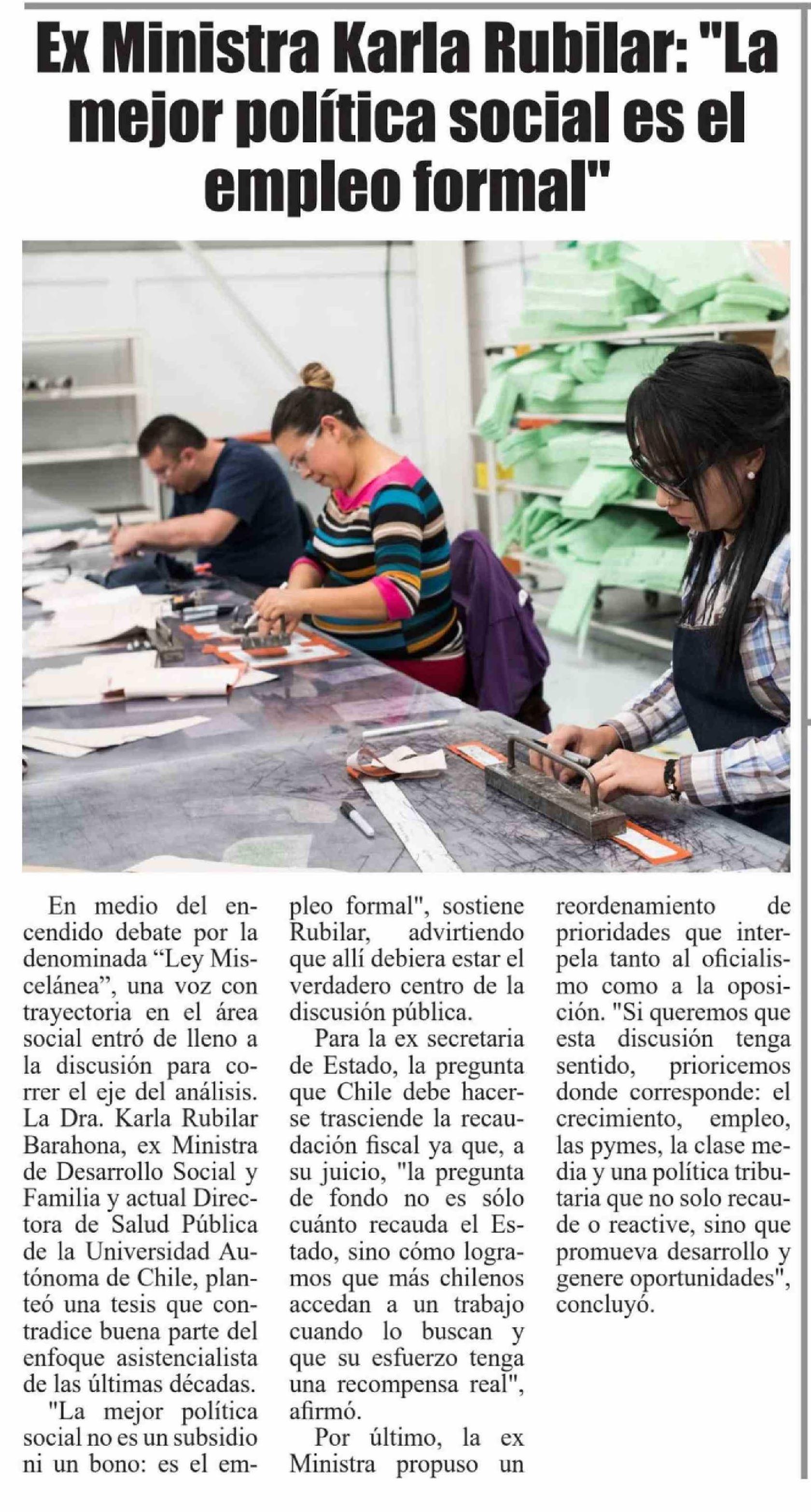 | Título: | Ex Ministra Karla Rubilar: "La mejor política social es el empleo formal" |