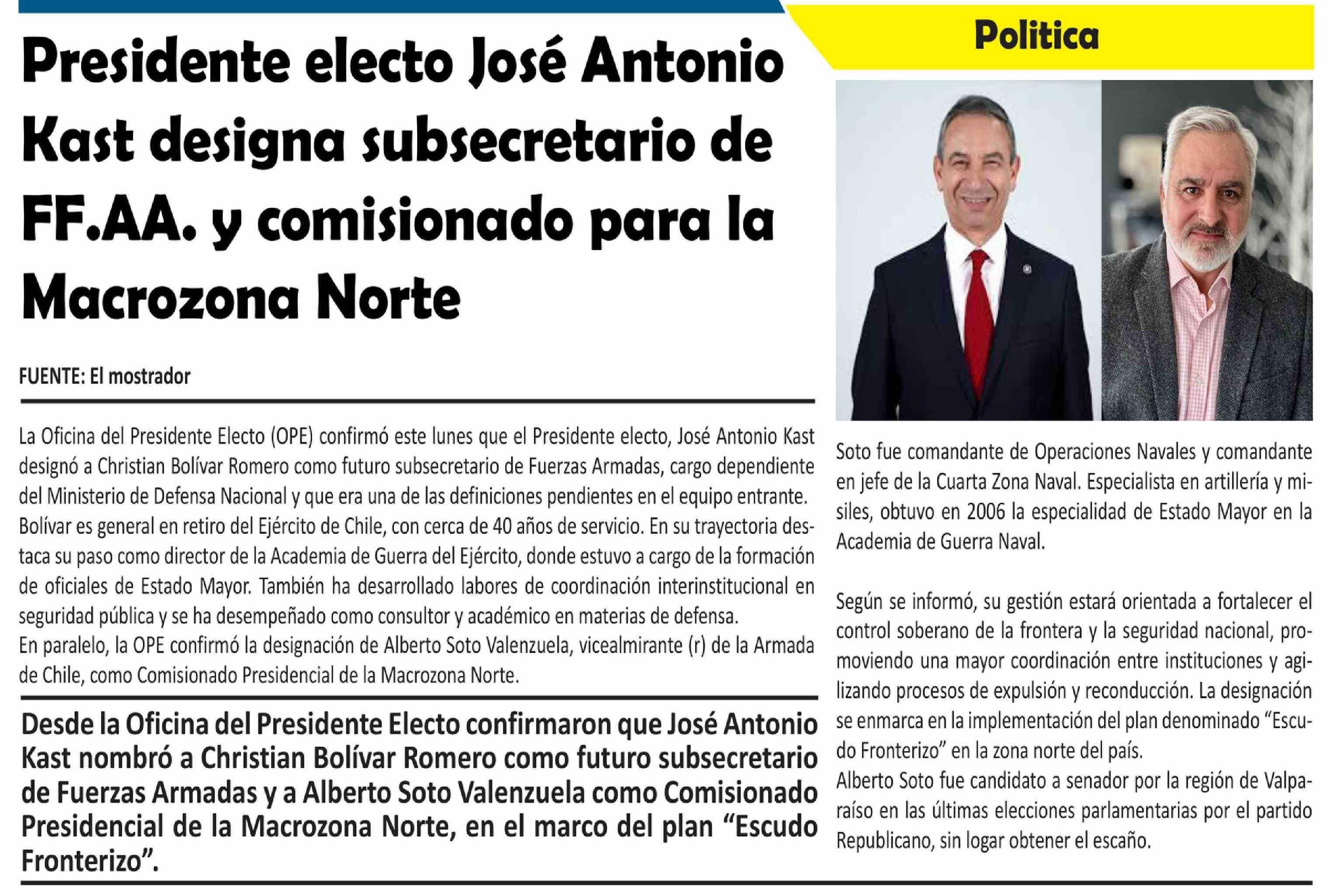 Presidente electo José Antonio Kast designa subsecretario de FF.AA. y comisionado para la Macrozona Norte 25-02-2026 El Longino |