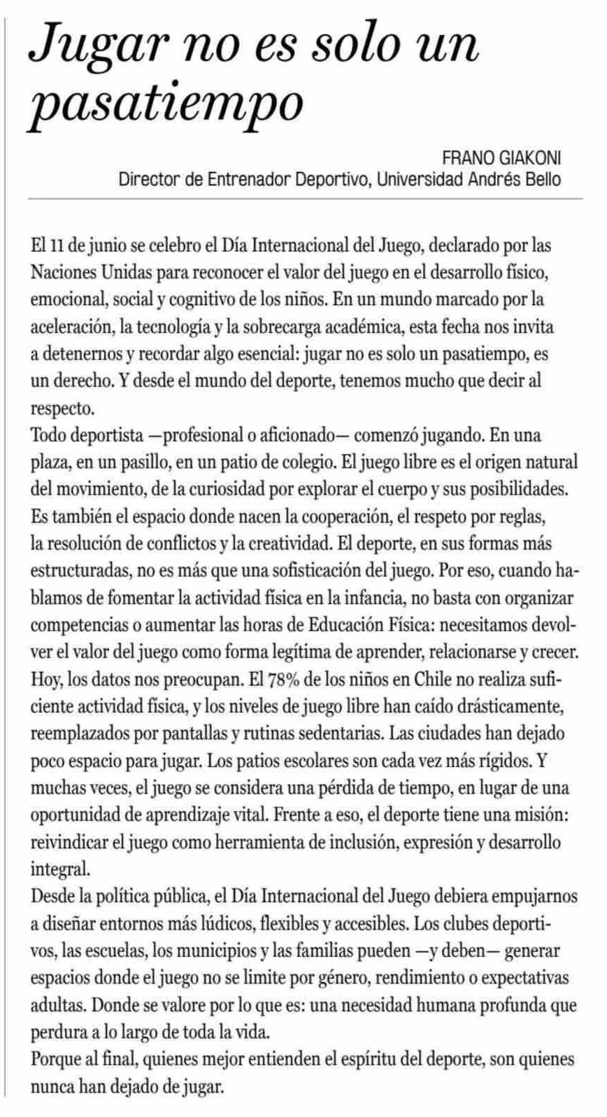CARTAS: Jugar no es solo un pasatiempo 13-06-2025 La Prensa de Curicó |
