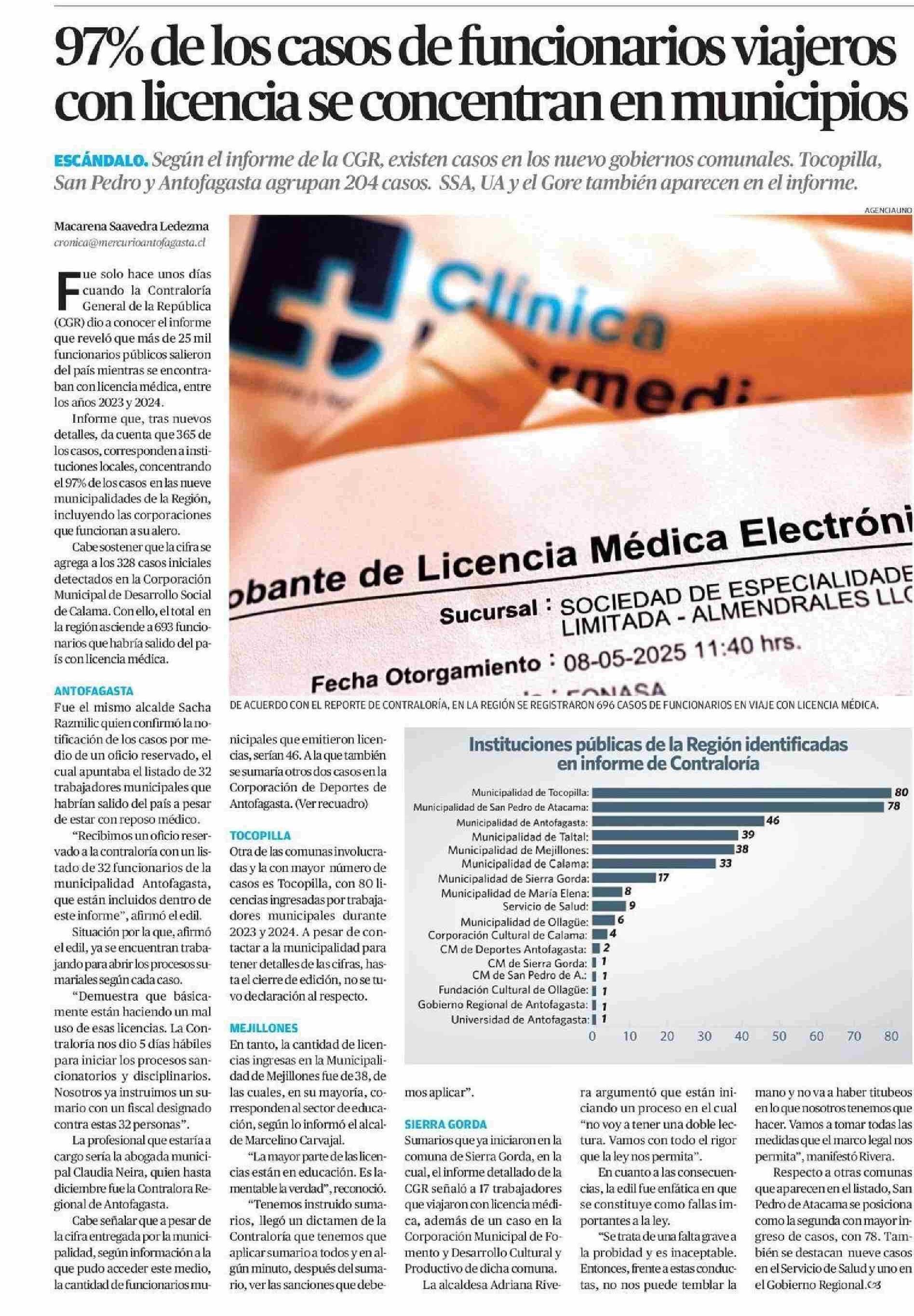 97% delos casos de funcionarios viajeros con licencia se concentran en municipios 24-05-2025 El Mercurio de Antofagasta |