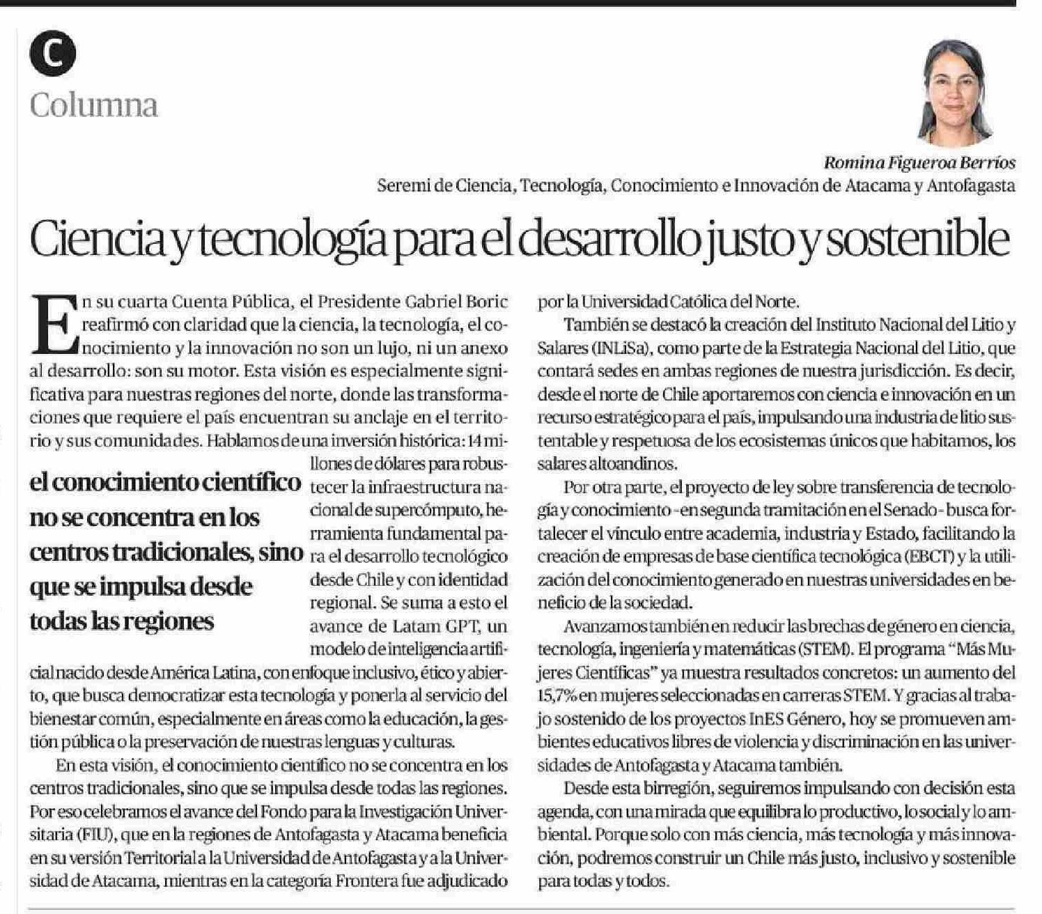 Columnas de Opinión: Ciencia y tecnología para el desarrollo justo y sostenible 14-06-2025 El Diario de Atacama |