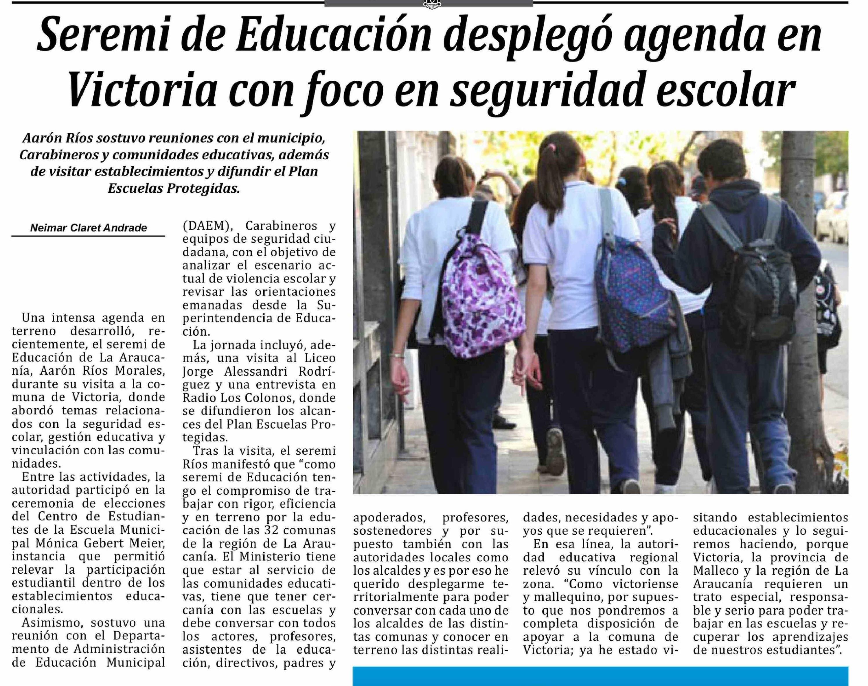 | Título: | Seremi de Educación desplegó agenda en Victoria con foco en seguridad escolar |