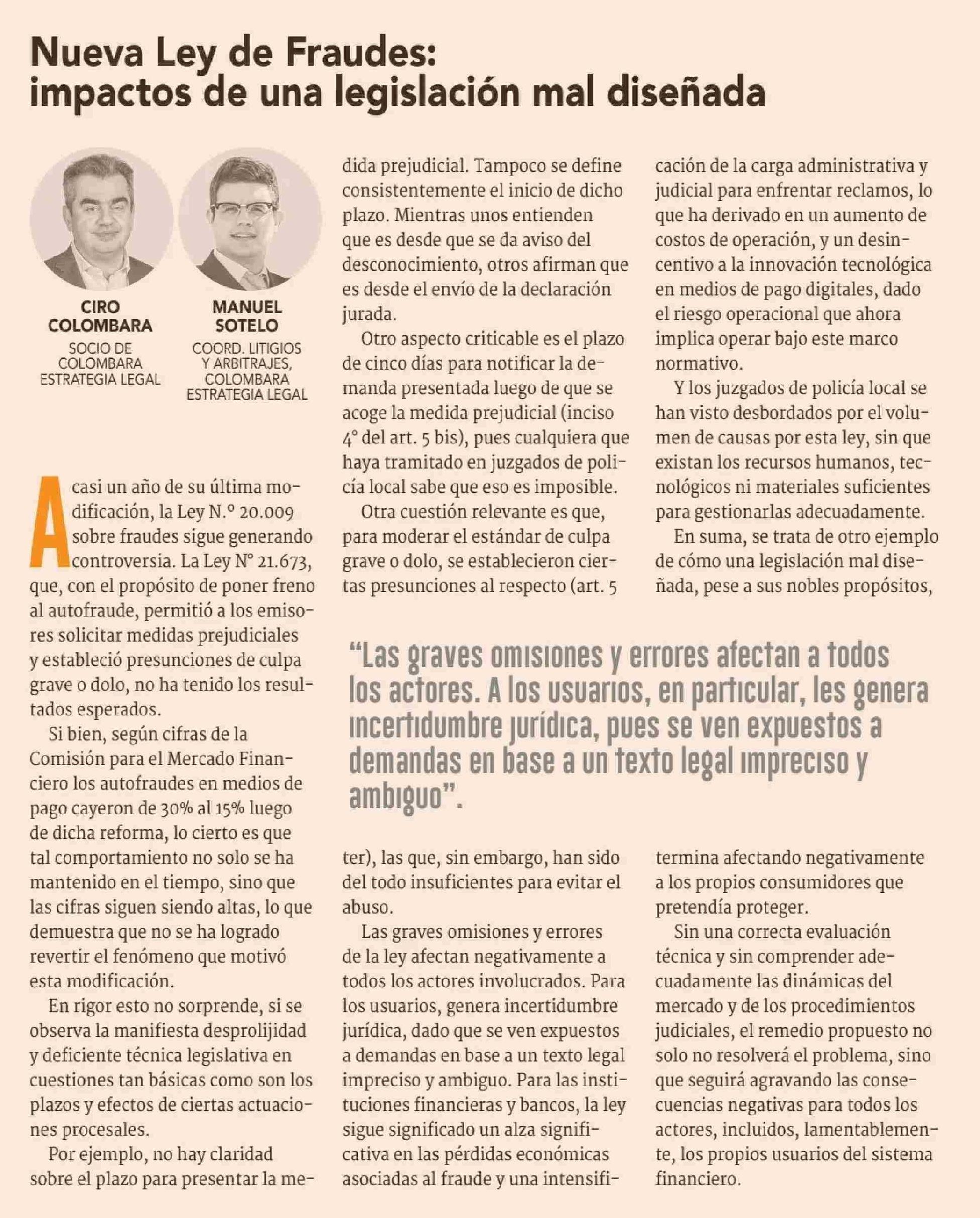COLUMNAS DE OPINIÓN: Nueva Ley de Fraudes: impactos de una legislación mal diseñada 27-05-2025 Diario Financiero |