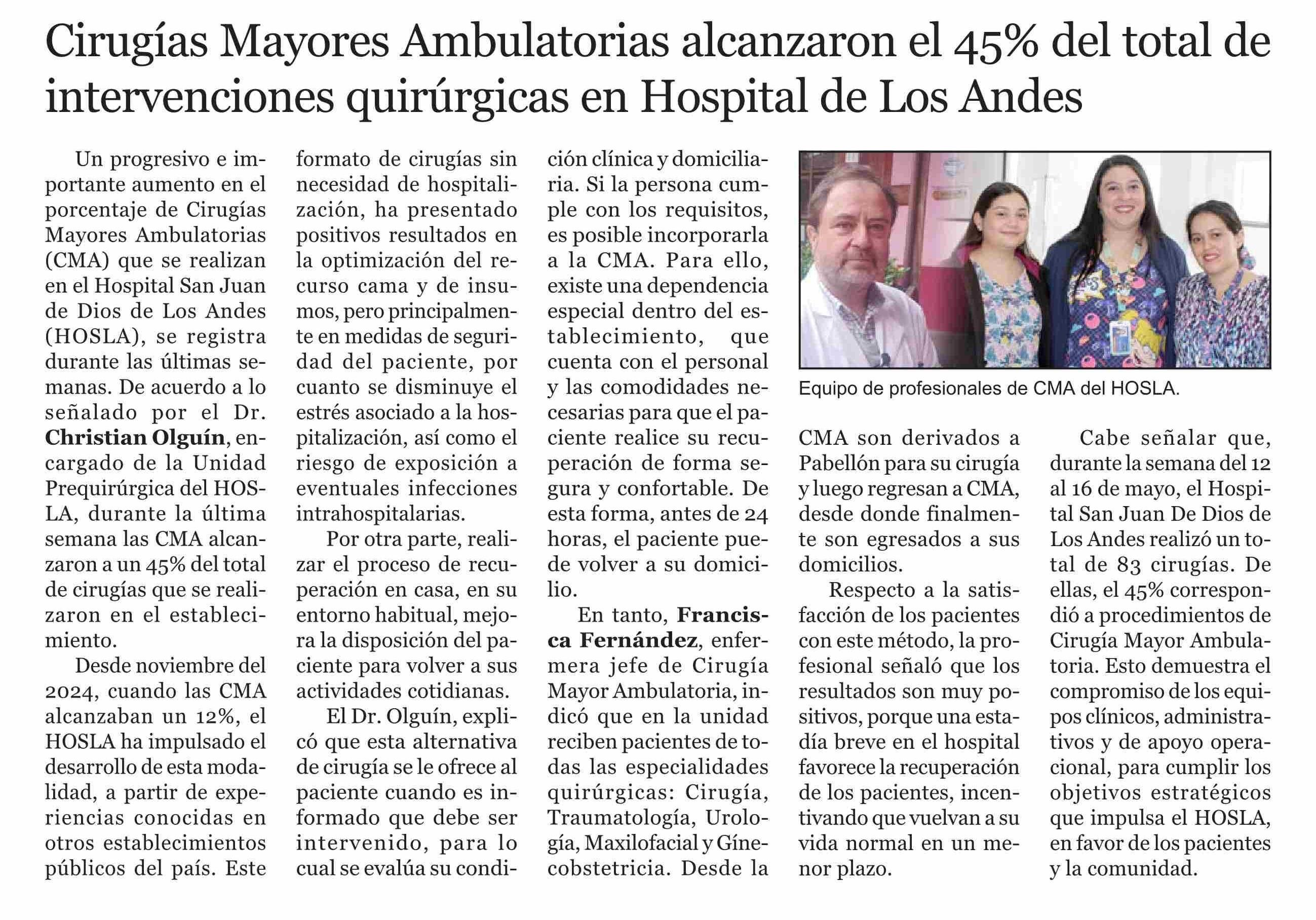 Cirugías Mayores Ambulatorias alcanzaron el 45% del total de intervenciones quirúrgicas en Hospital de Los Andes 26-05-2025 El Trabajo |