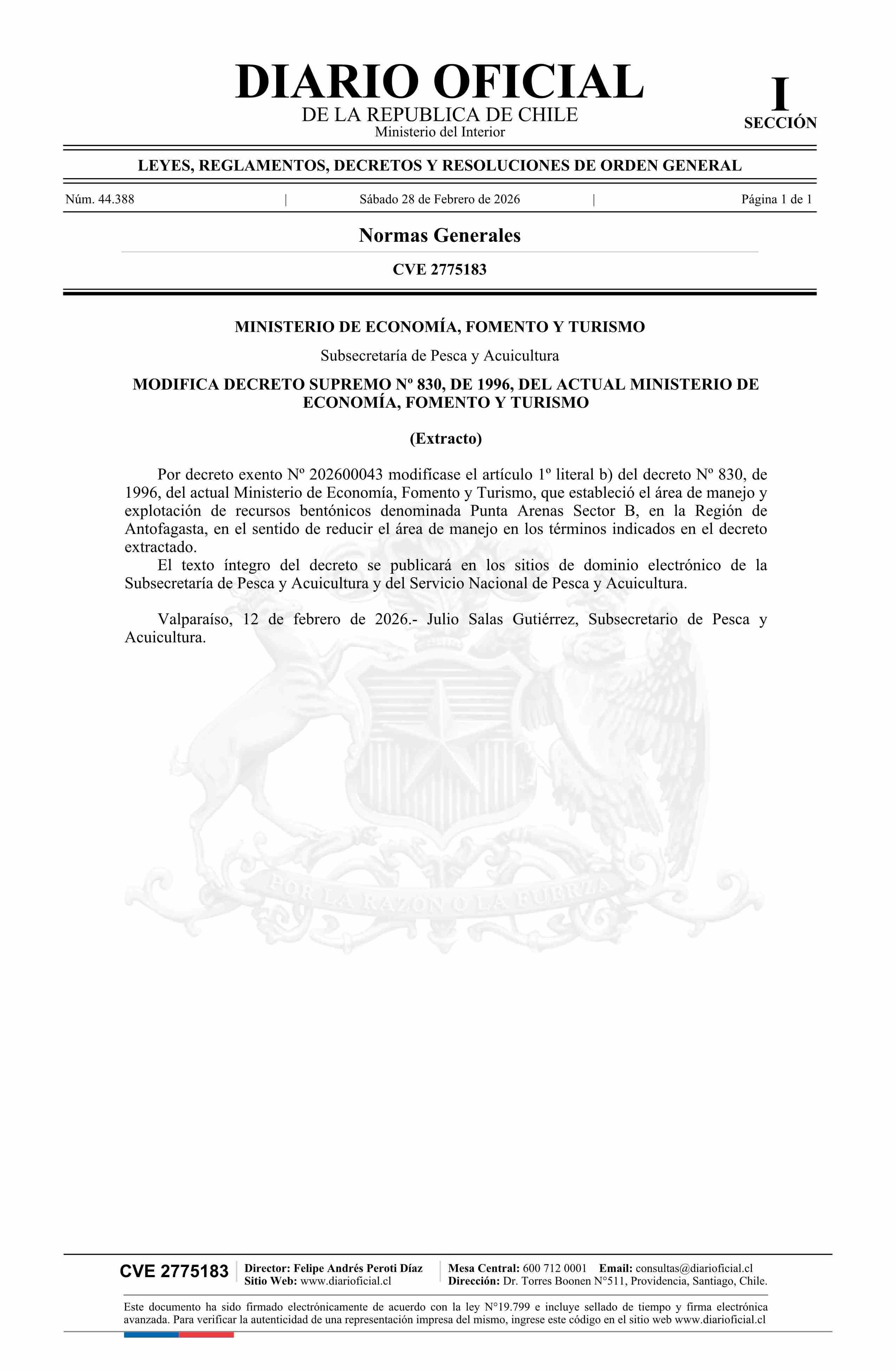| Título: | Extracto de decreto exento número 202600043, de 2026.- Modifica decreto supremo Nº 830, de 1996 |