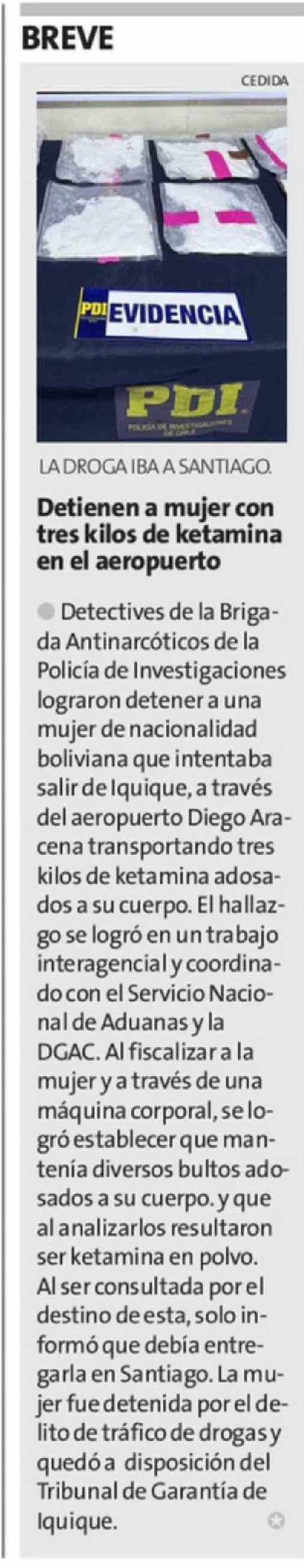Título: Detienen a mujer con tres kilos de ketamina en el aeropuerto