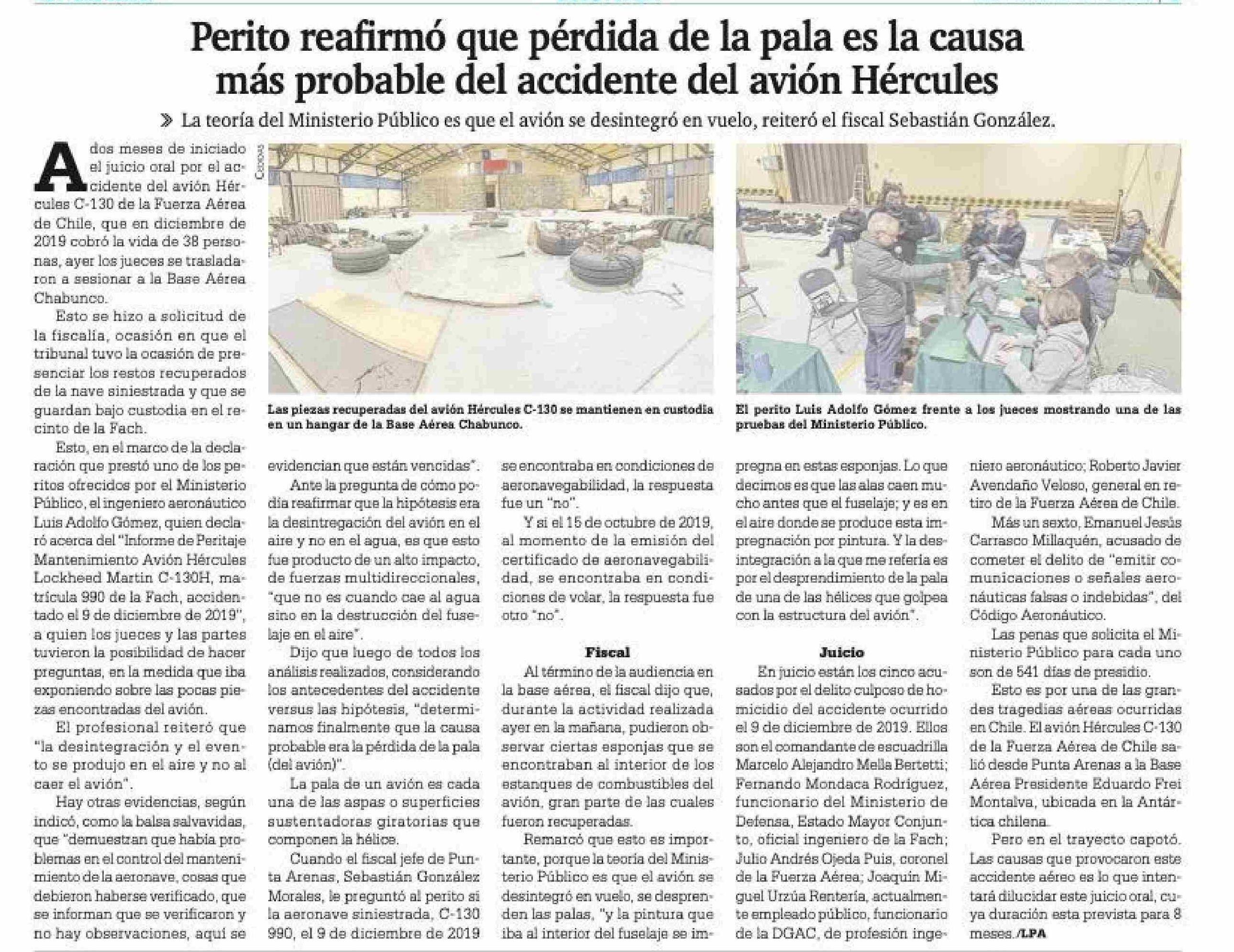 Perito reafirmó que pérdida de la pala es la causa más probable del accidente del avión Hércules 22-04-2026 La Prensa Austral |