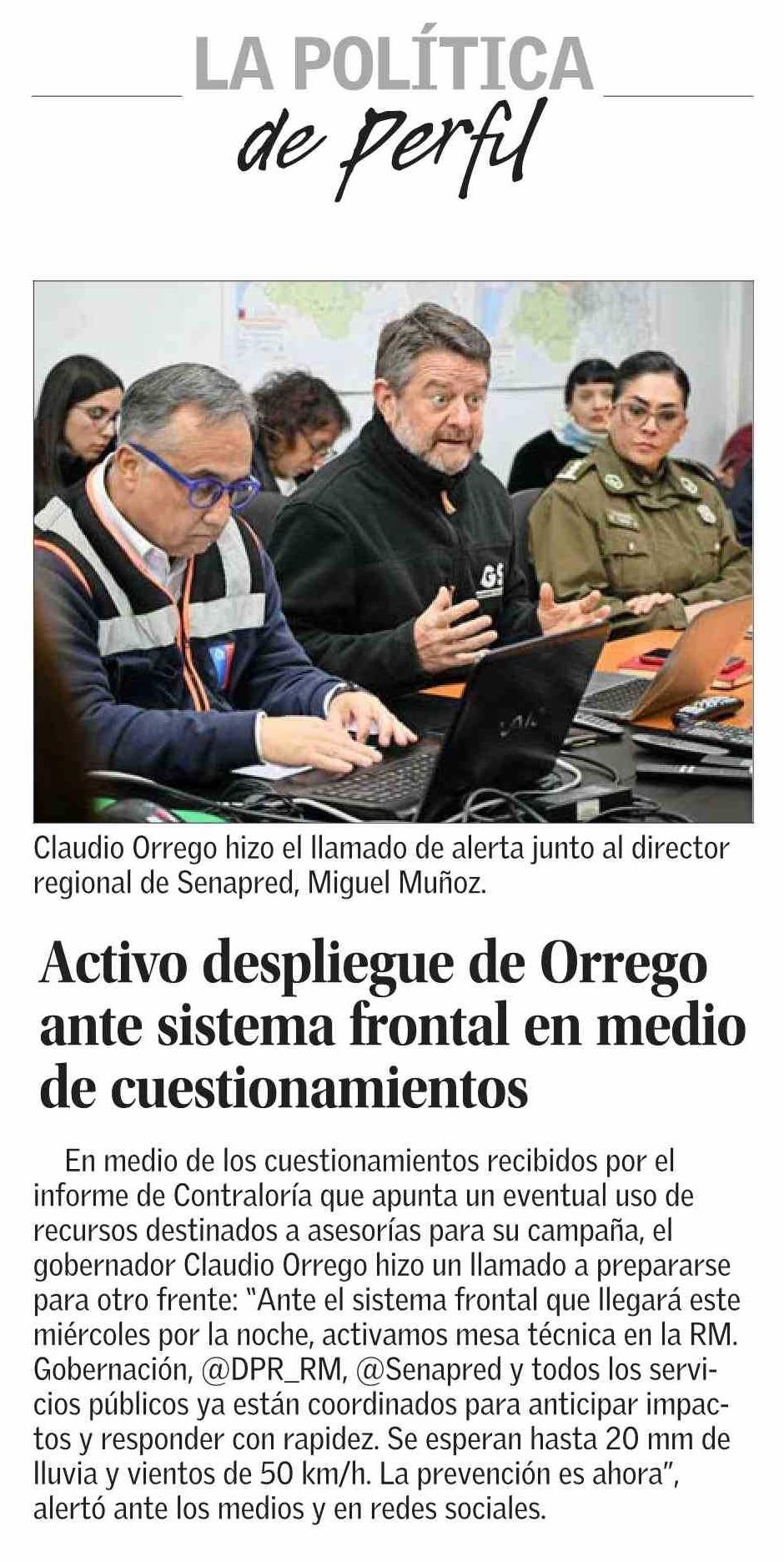 Activo despliegue de Orrego ante sistema frontal en medio de cuestionamientos 10-06-2025 El Mercurio |