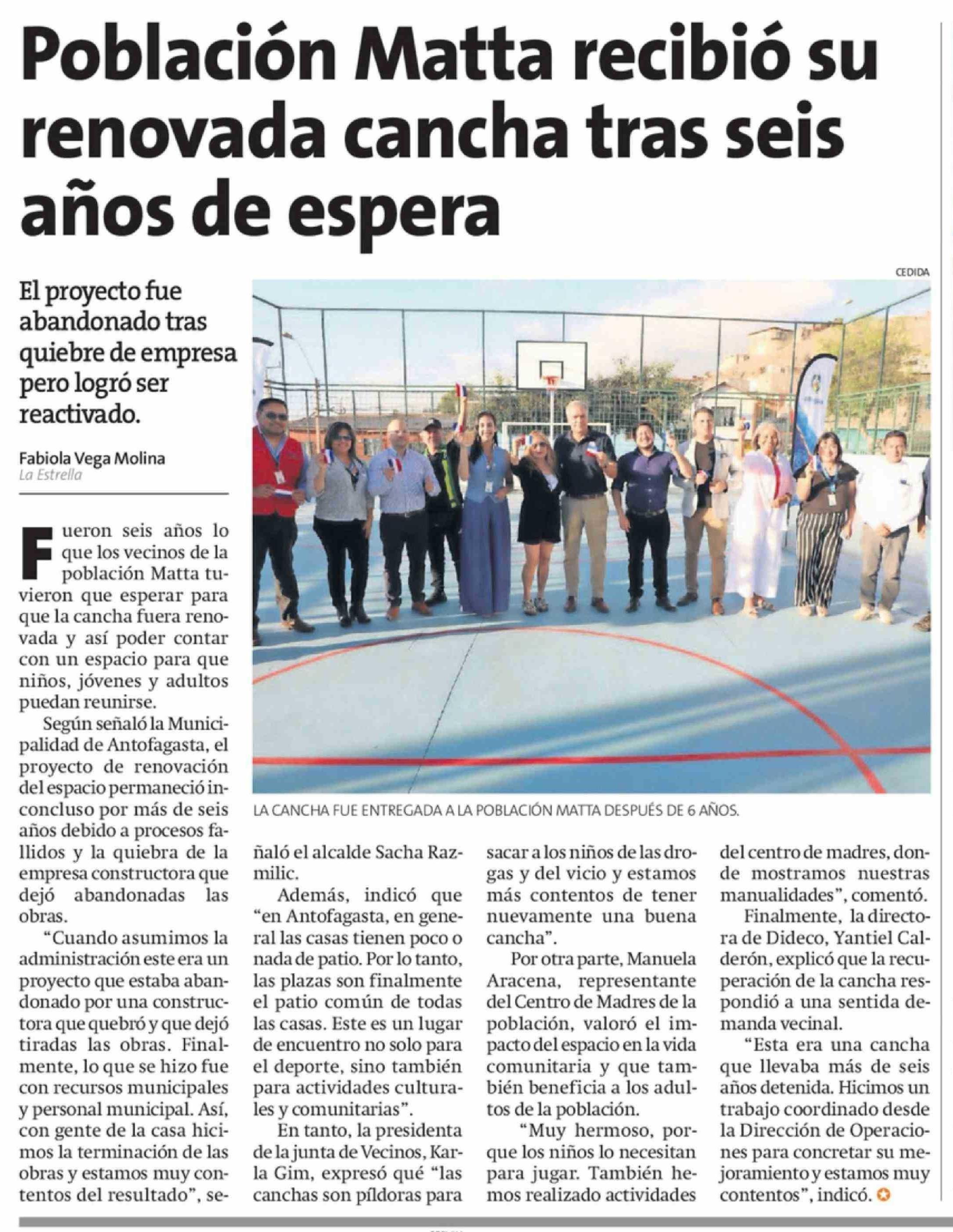 Población Matta recibió su renovada cancha tras seis años de espera 06-03-2026 La Estrella de Antofagasta |
