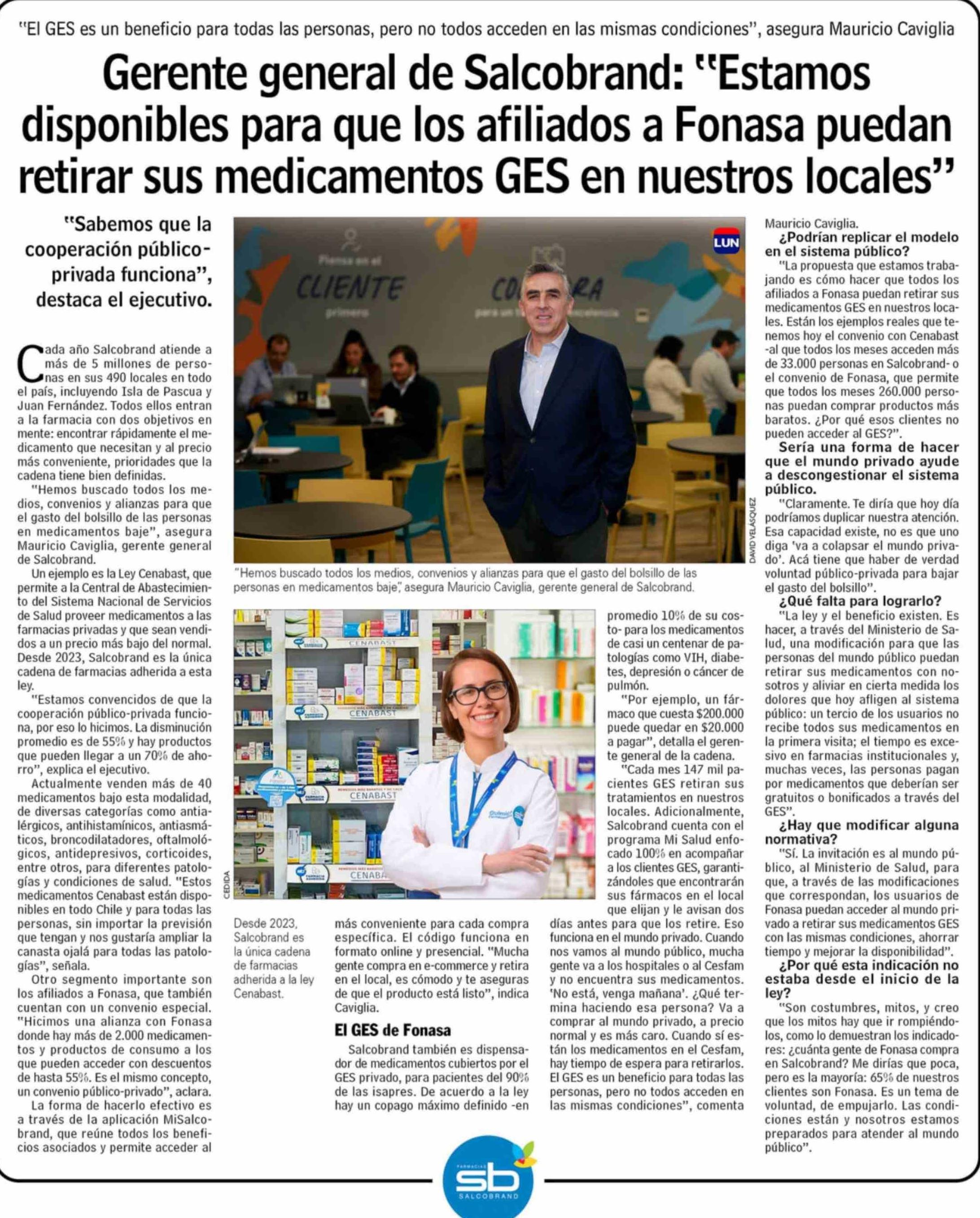 Gerente general de Salcobrand: "Estamos disponibles para que los afiliados a Fonasa puedan retirar sus medicamentos GES en nuestros locales" 24-04-2026 Las Últimas Noticias |