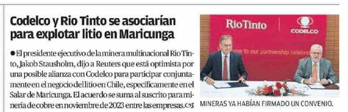 Codelco y Rio Tinto se asociarían para explotar litio en Maricunga 13-12-2024 El Mercurio de Calama |