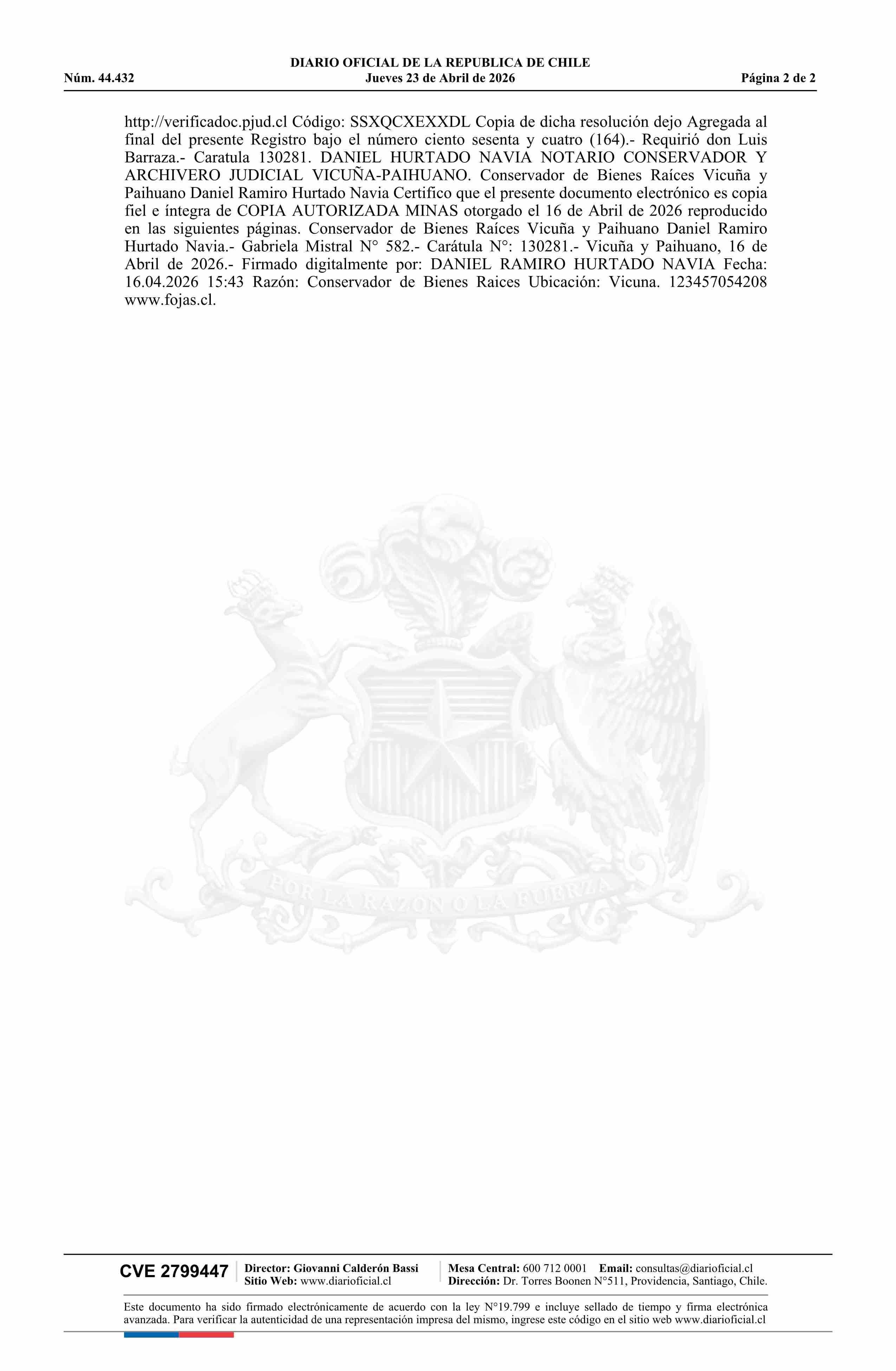 HERMINIA 1 / Corporación Nacional del Cobre de Chile 23-04-2026 DIARIO OFICIAL CHILE - BOLETÍN OFICIAL DE MINERÍA |