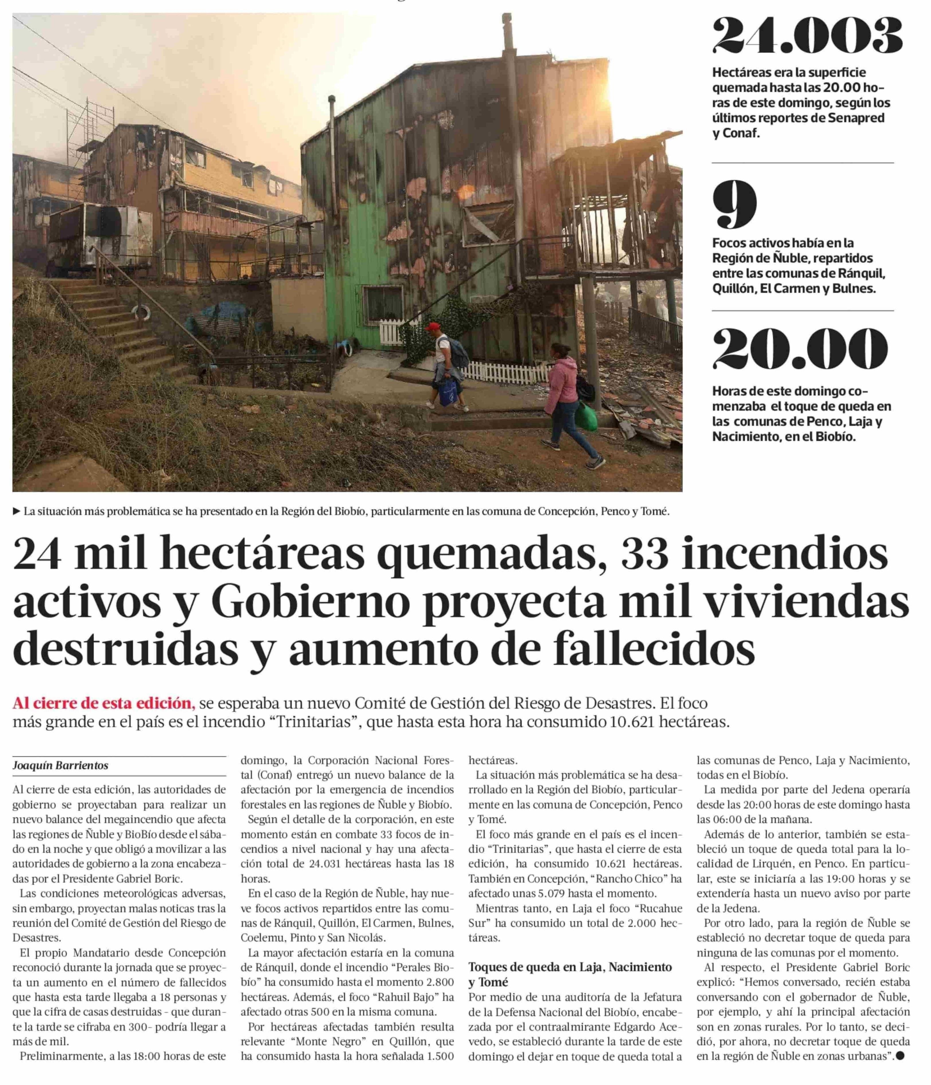 Título: 24 Mil hectáreas quemadas, 33 incendios activos y Gobierno proyecta mil viviendas destruidas y aumento de fallecidos