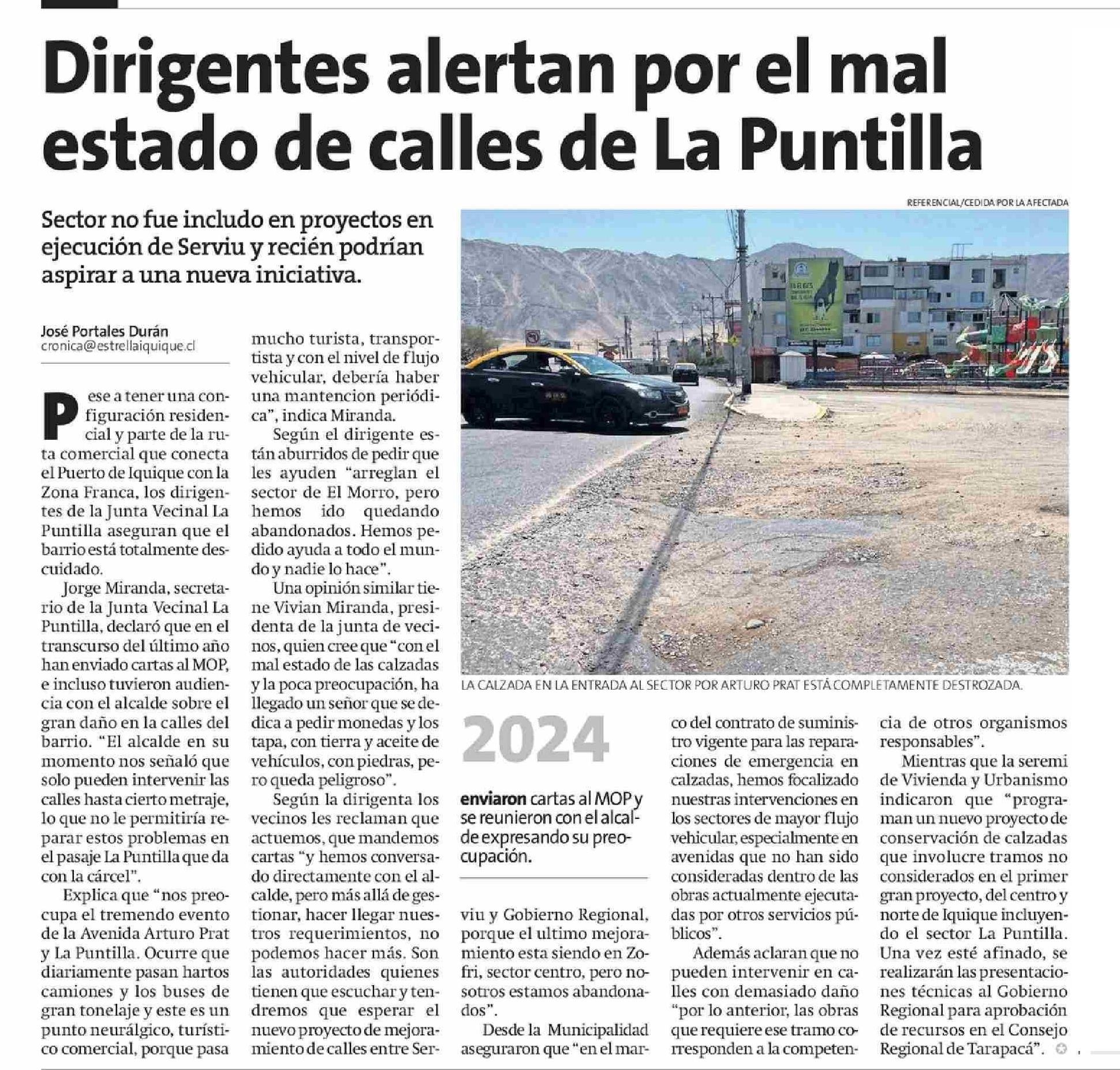 Dirigentes alertan por el mal estado de calles de La Puntilla 13-02-2026 La Estrella de Iquique |