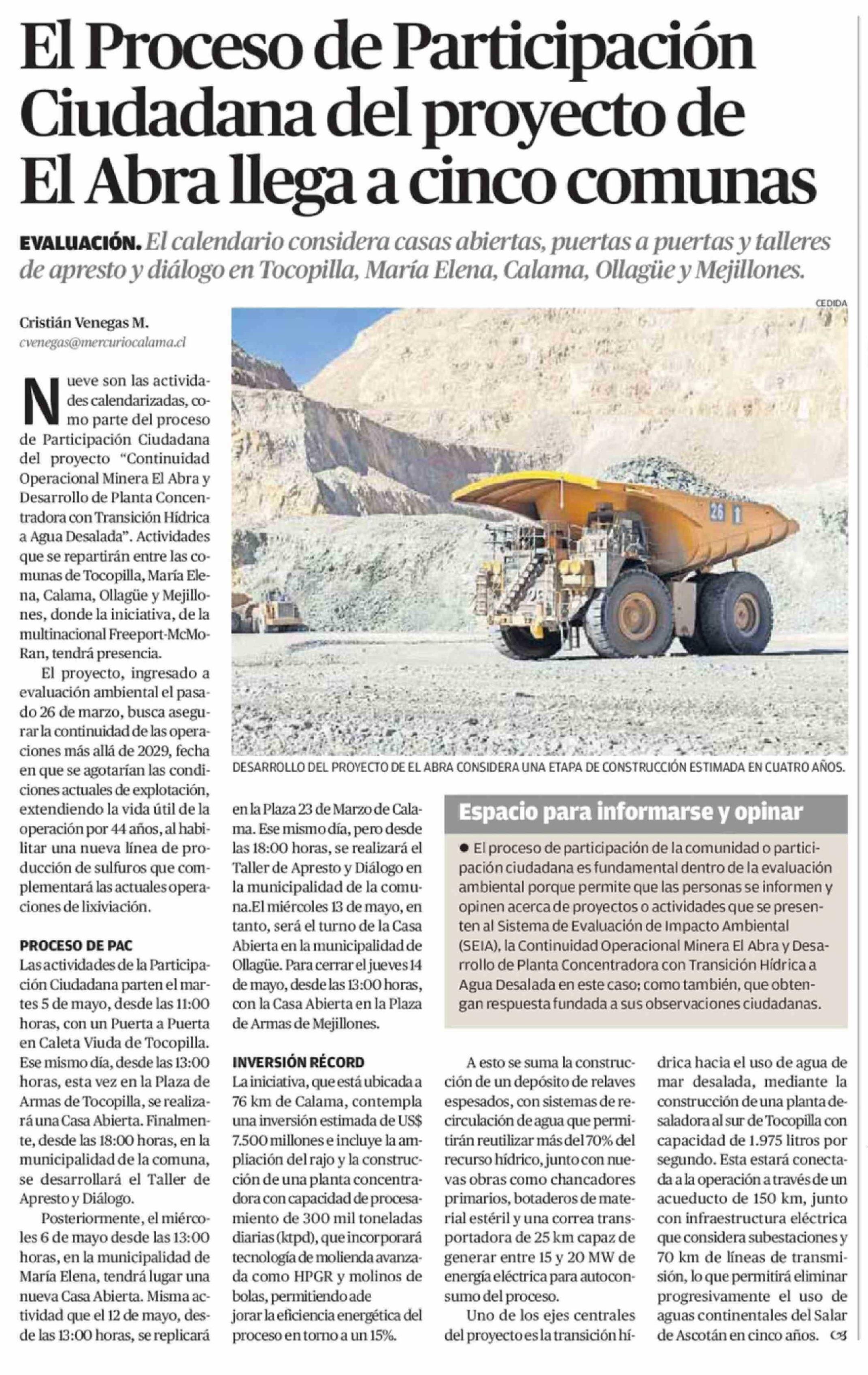 El Proceso de Participación Ciudadana del proyecto de El Abra llega a cinco comunas 25-04-2026 El Mercurio de Calama |