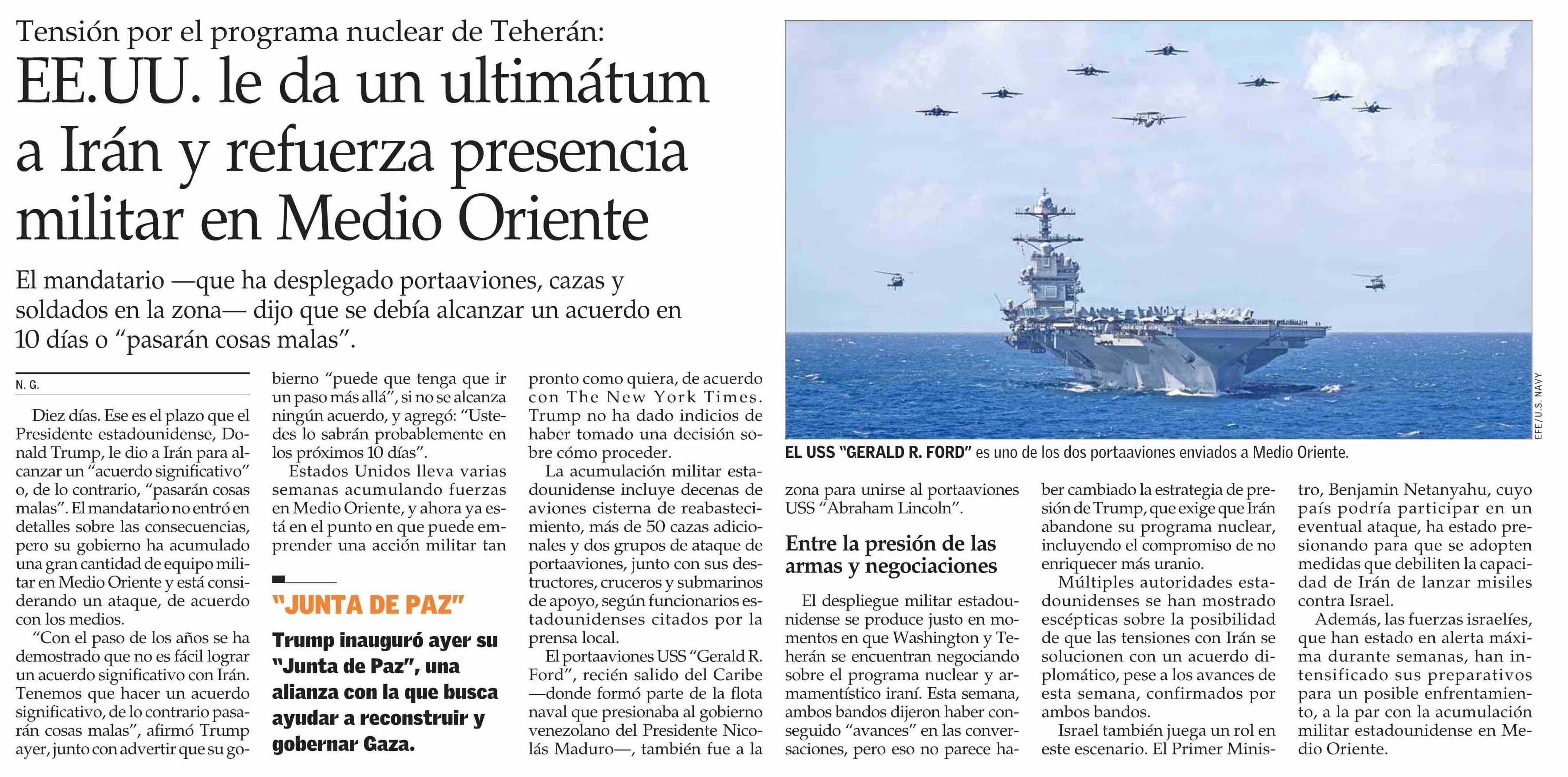 EE.UU. le da un ultimátum a Irán y refuerza presencia militar en Medio Oriente 20-02-2026 El Mercurio |