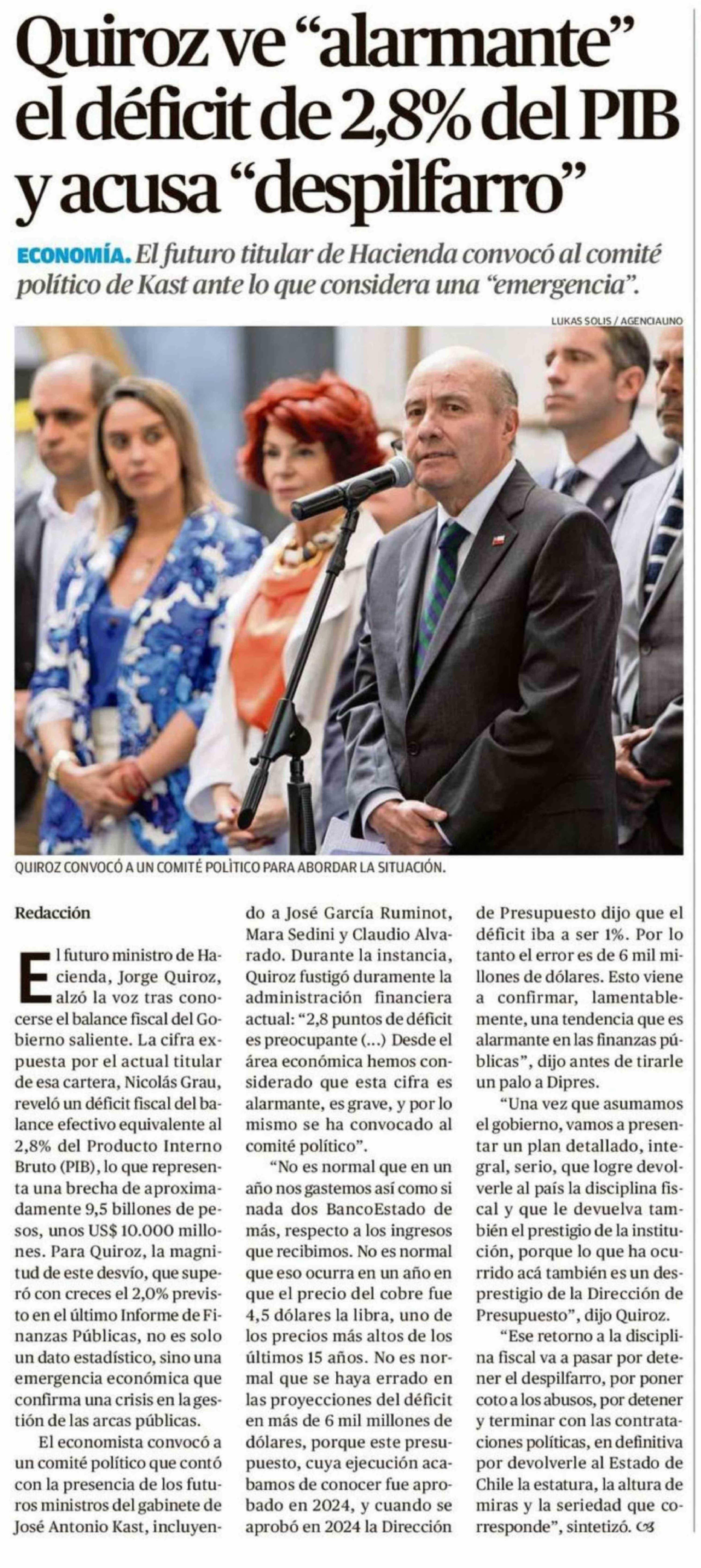 Título: Quiroz ve "alarmante" el déficit de 2,8% del PIB y acusa "despilfarro"