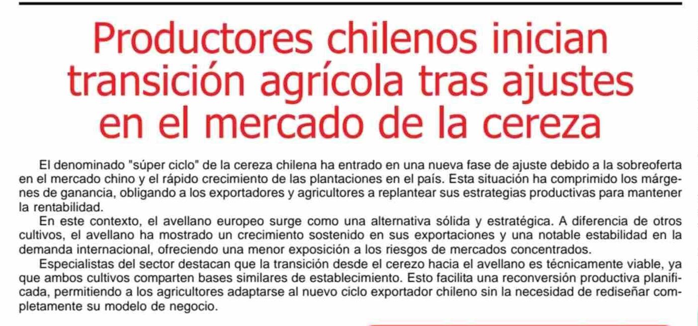 | Título: | Productores chilenos inician transición agrícola tras ajustes en el mercado de la cereza |