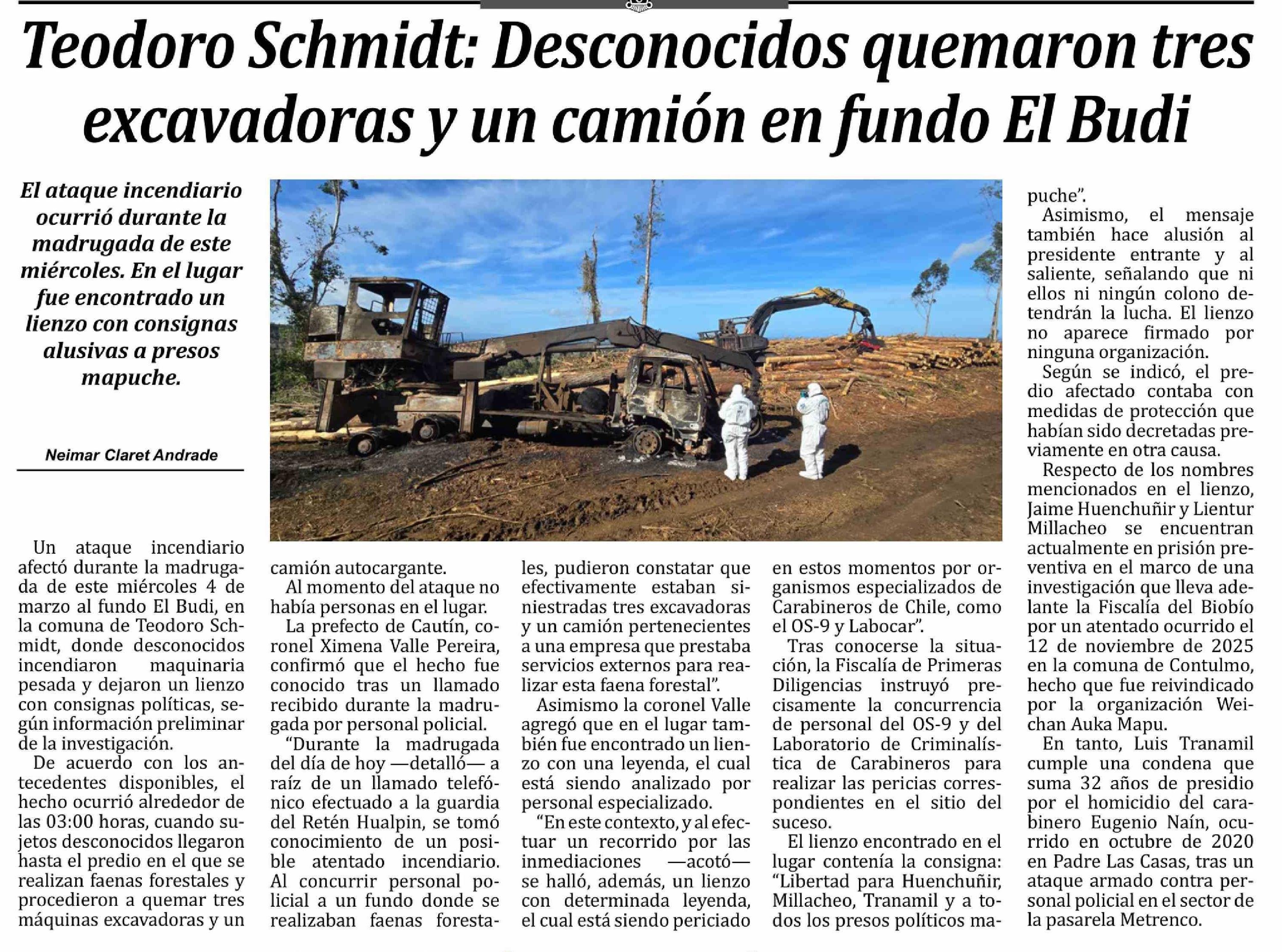 | Título: | Teodoro Schmidt: Desconocidos quemaron tres excavadoras y un camión en fundo El Budi |