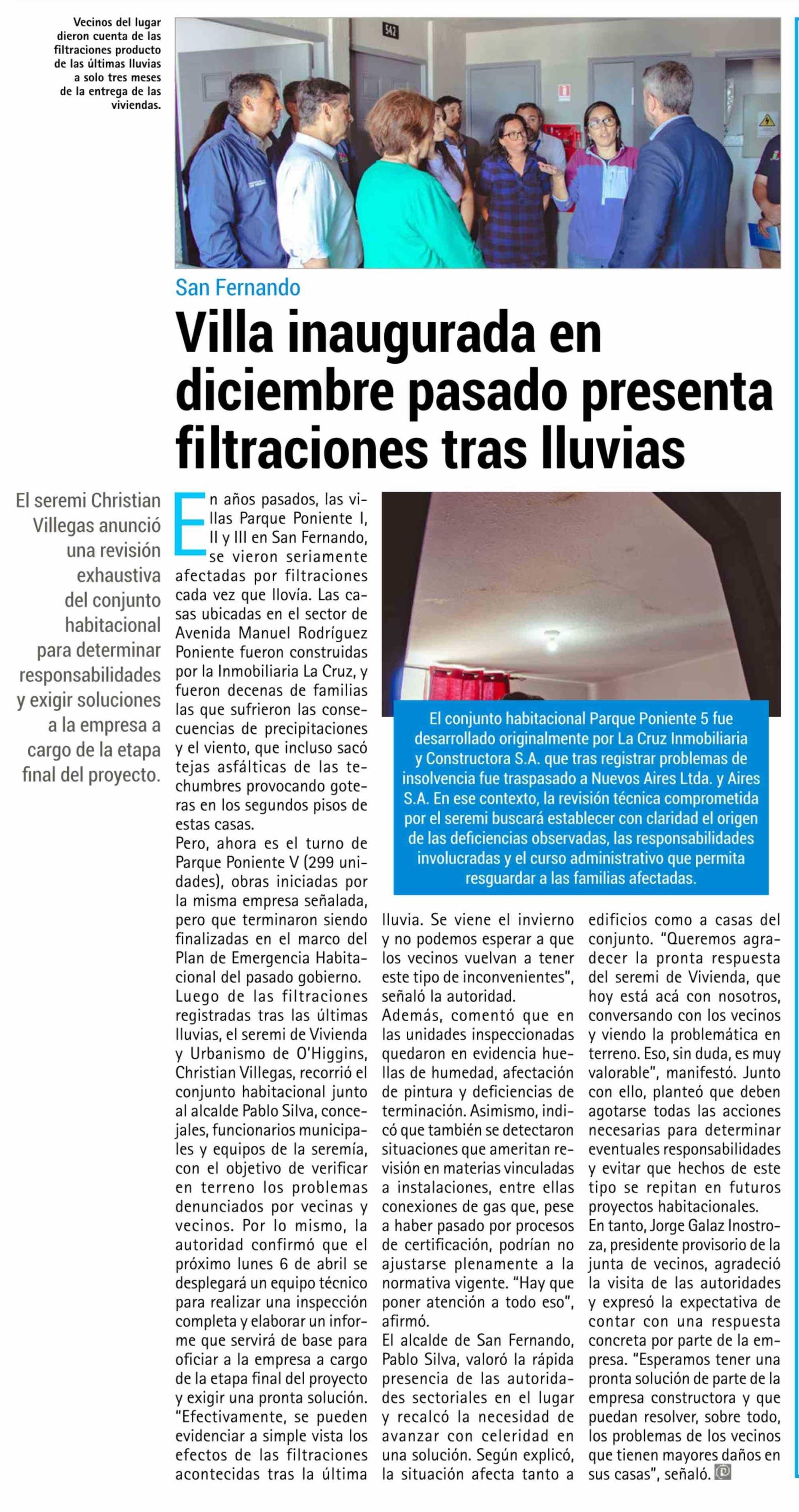 Villa inaugurada en diciembre pasado presenta filtraciones tras lluvias 01-04-2026 El Rancagüino |