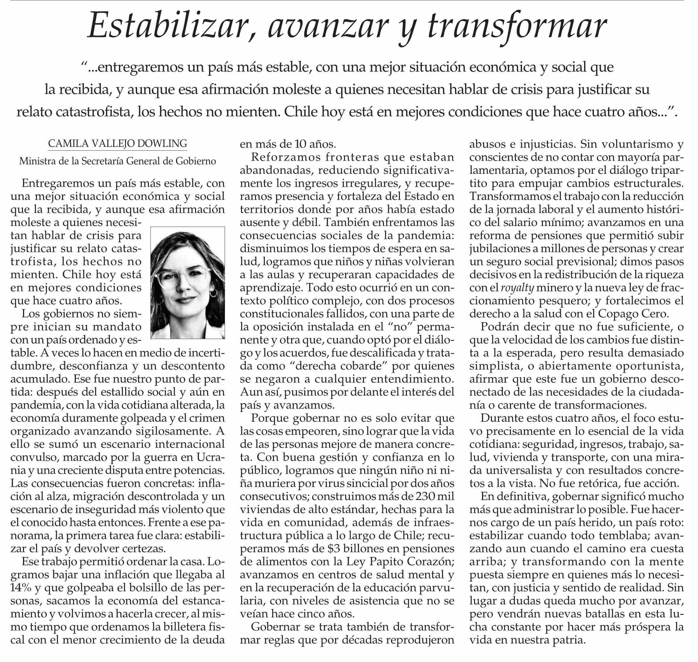 Columnas de Opinión: Estabilizar, avanzar y transformar