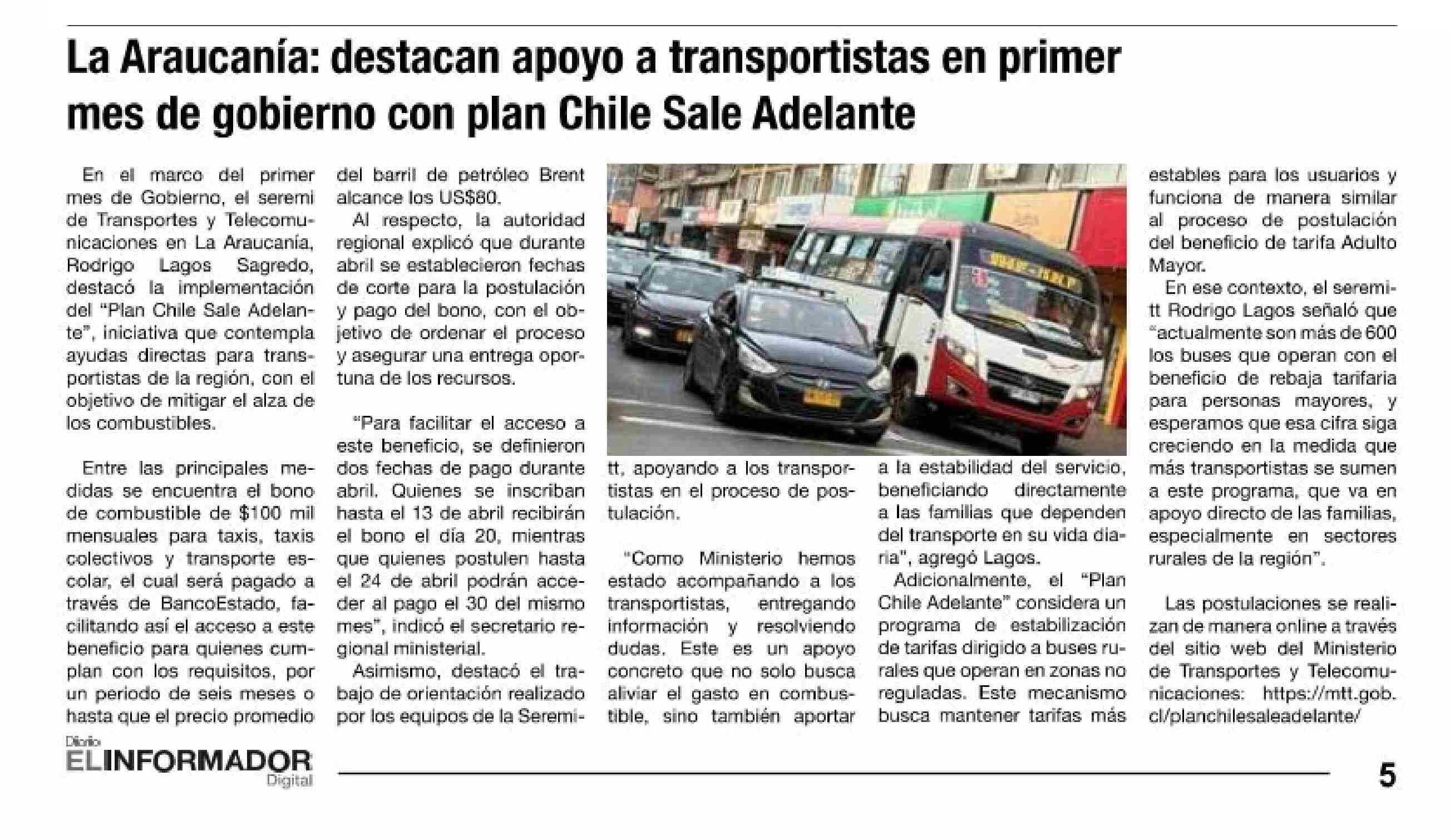 La Araucania: destacan apoyo a transportistas en primer mes de gobierno con plan Chile Sale Adelanle 14-04-2026 El Informador |
