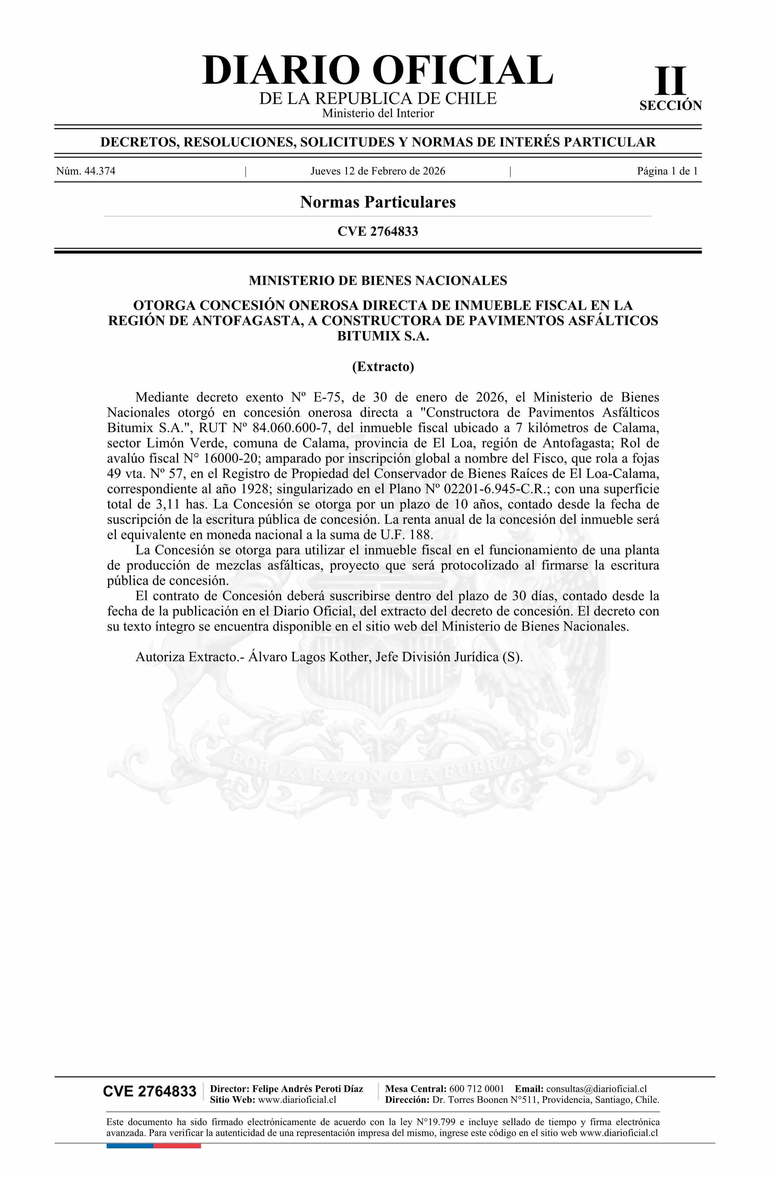| Título: | Extracto de decreto exento número E-75, de 2026.- Otorga concesión onerosa directa de inmueble fiscal en la Región de Antofagasta, a Constructora de Pavimentos Asfálticos Bitumix S.A. |