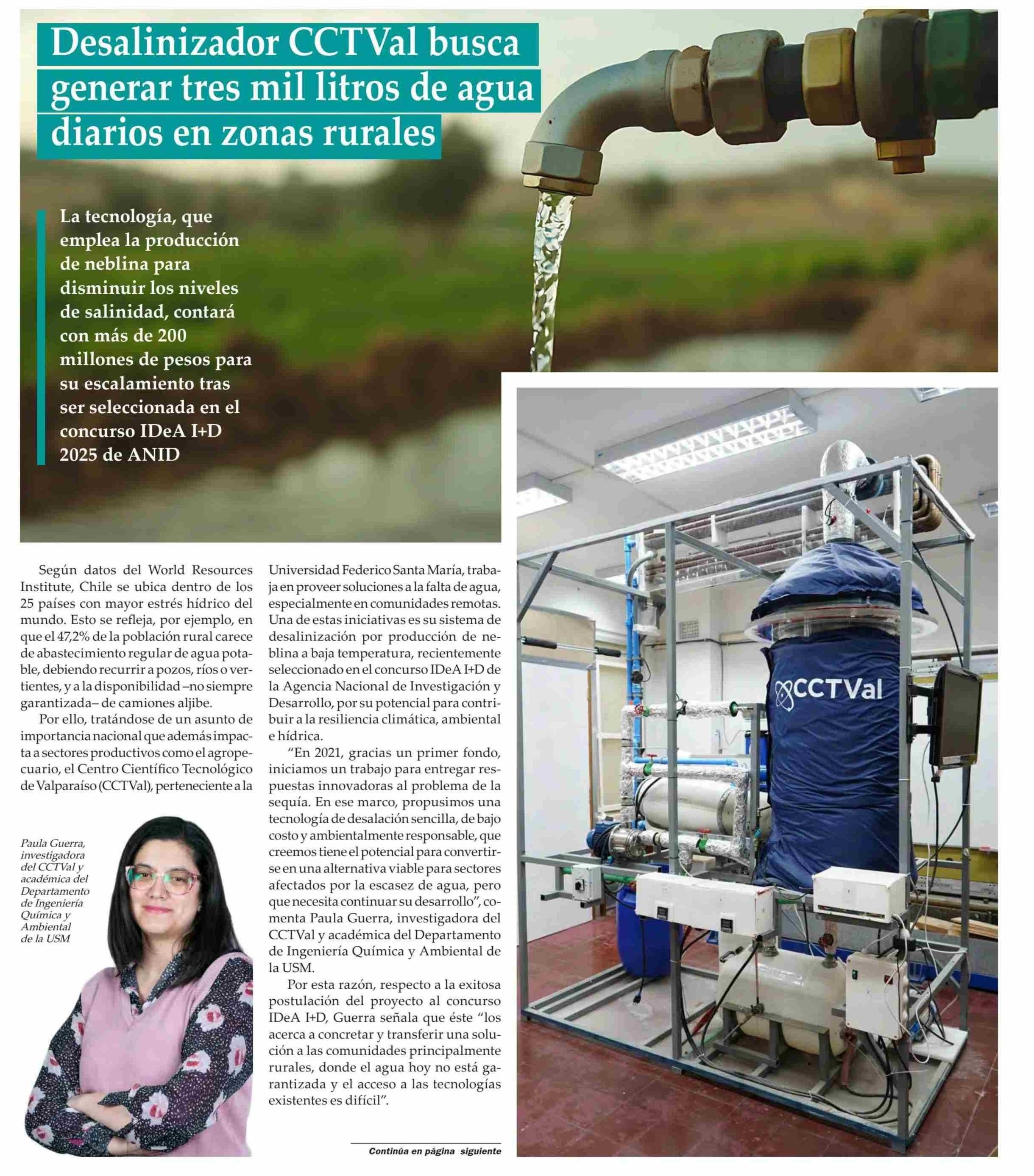 | Título: | Desalinizador CCTVal busca generar tres mil litros de agua diarios en zonas rurales |