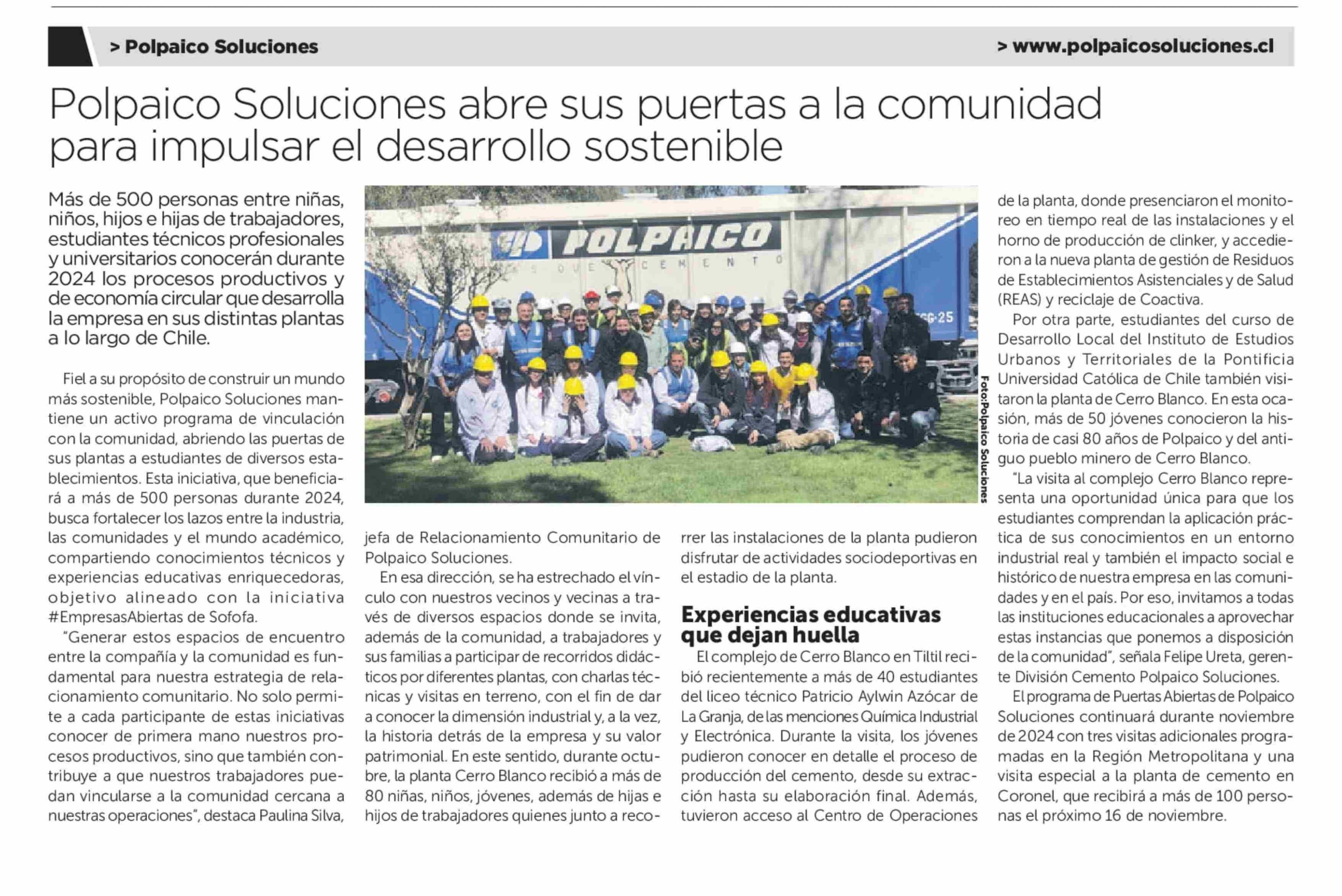 Polpaico Soluciones abre sus puertas a la comunidad Dara impulsar el desarrollo sostenible 03-11-2024 La Tercera |