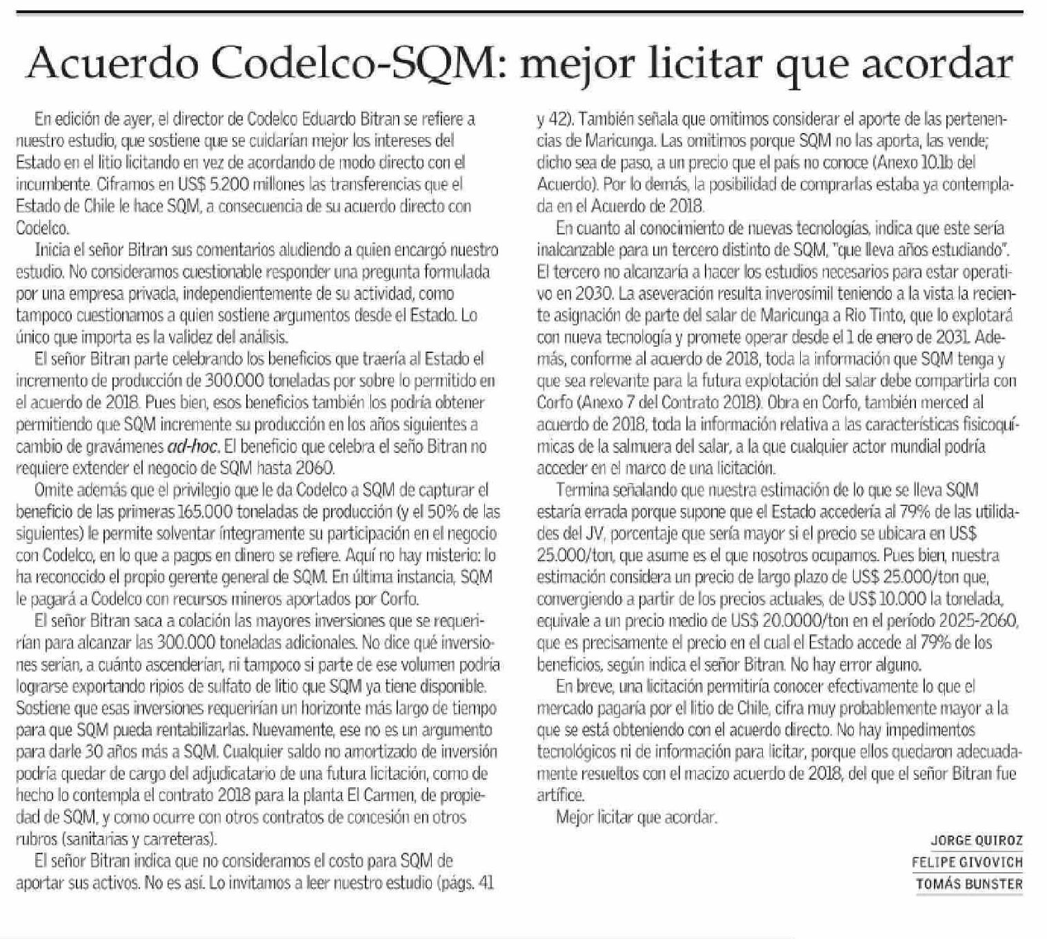 CARTAS: Acuerdo Codelco-SQM: mejor licitar que acordar 29-05-2025 El Mercurio |