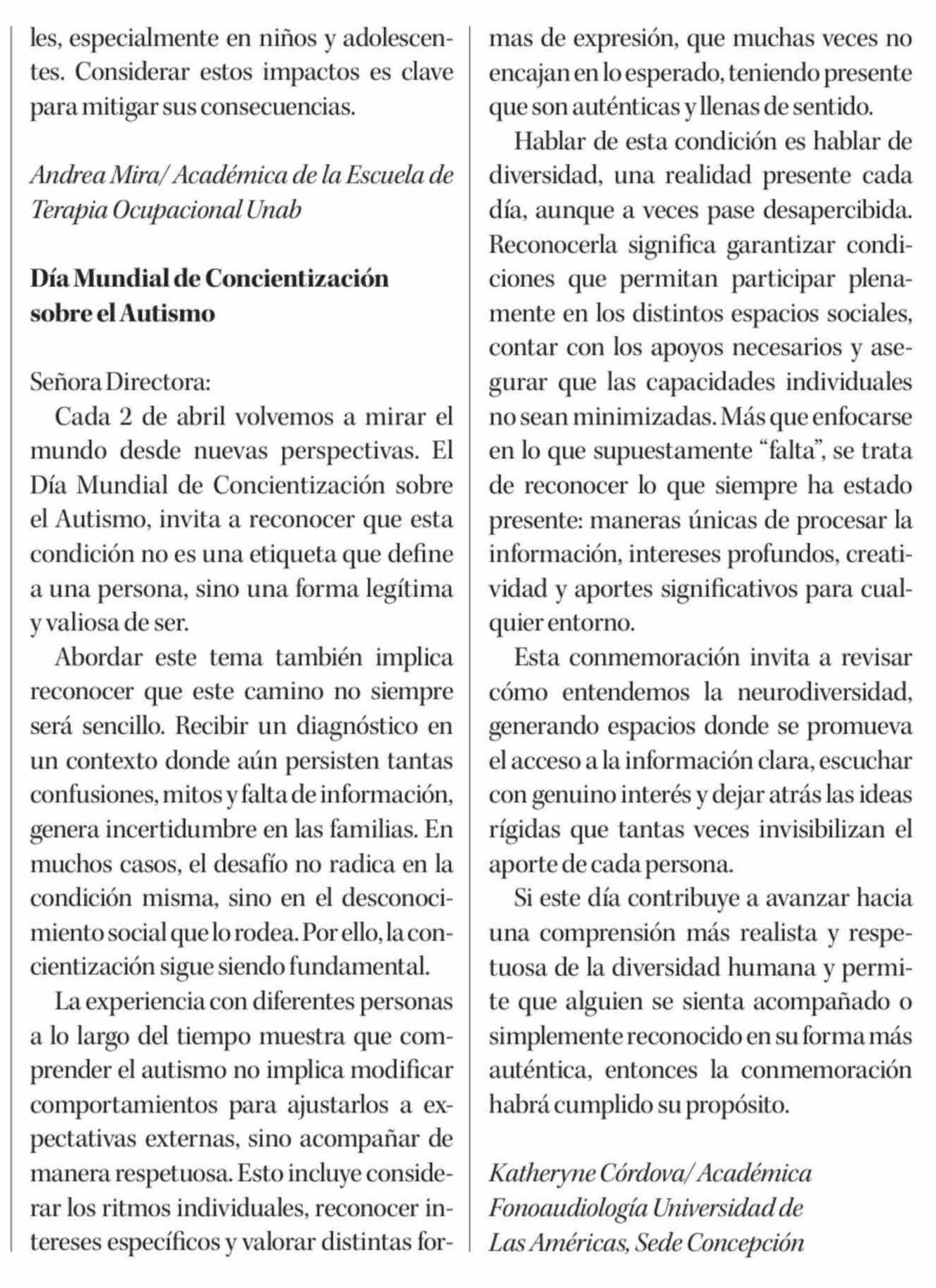 Cartas: Día Mundial de Concientización sobre el Autismo 02-04-2026 Diario Concepción |