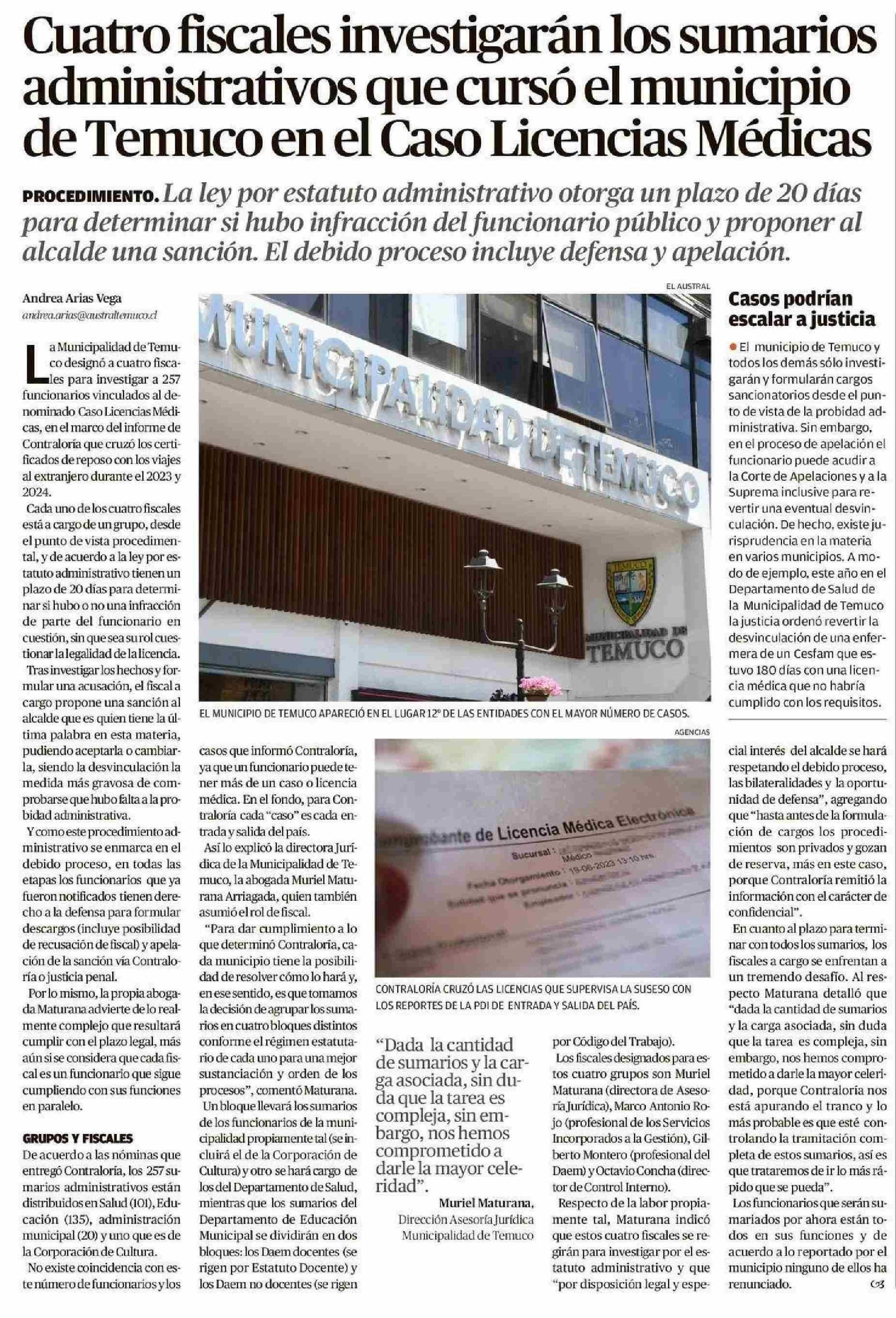 Cuatro fiscales investigarán los sumarios administrativos que cursó el municipio de Temuco en el Caso Licencias Médicas 29-05-2025 El Austral de la Araucanía |