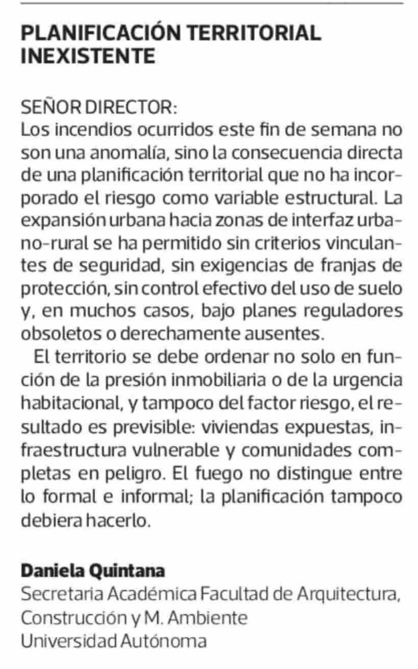 Cartas: PLANIFICACIÓN TERRITORIAL INEXISTENTE 20-01-2026 La Tercera |
