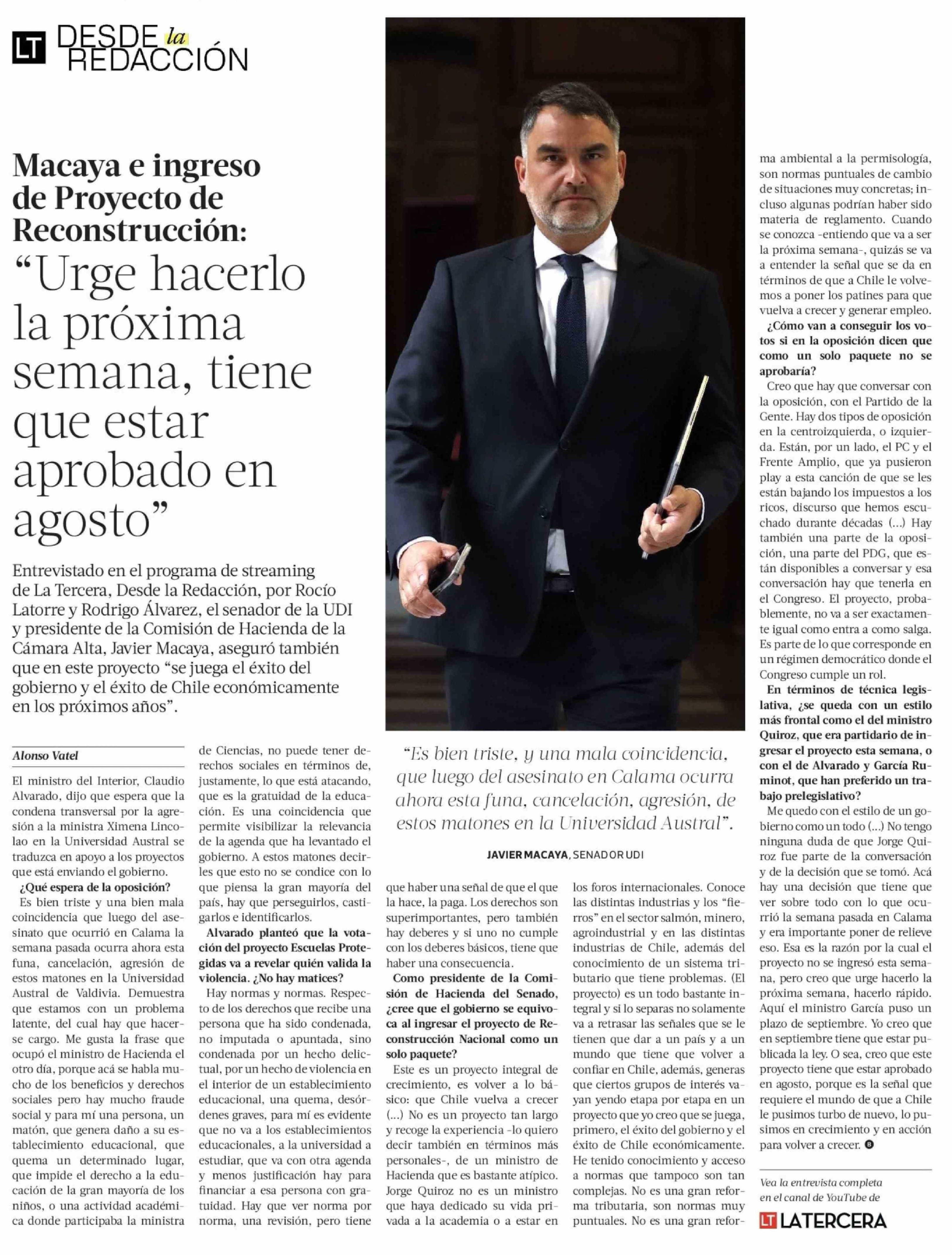 Macaya e ingreso de Proyecto de "Urge hacerlo la próxima semana, tiene que estar aprobado en agosto" 10-04-2026 La Tercera |