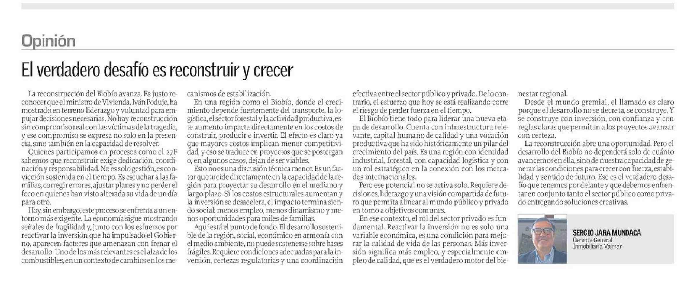 COLUMNAS DE OPINIÓN: El verdadero desafío es reconstruir y crecer 12-04-2026 El Sur |