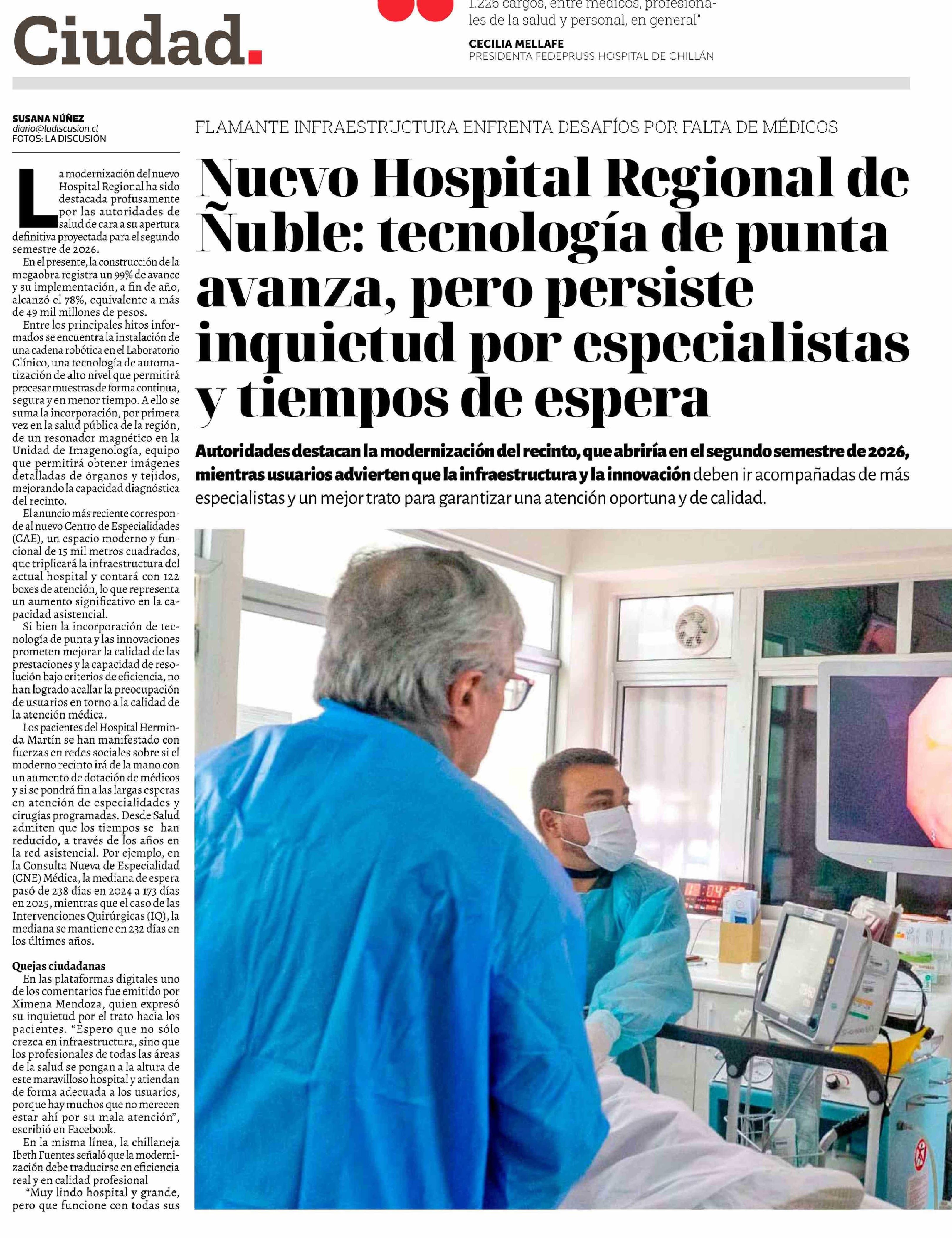 Nuevo Hospital Regional de Nuble: tecnología de punta avanza, pero persiste inquietud por especialistas y tiempos de espera 01-03-2026 La Discusión |
