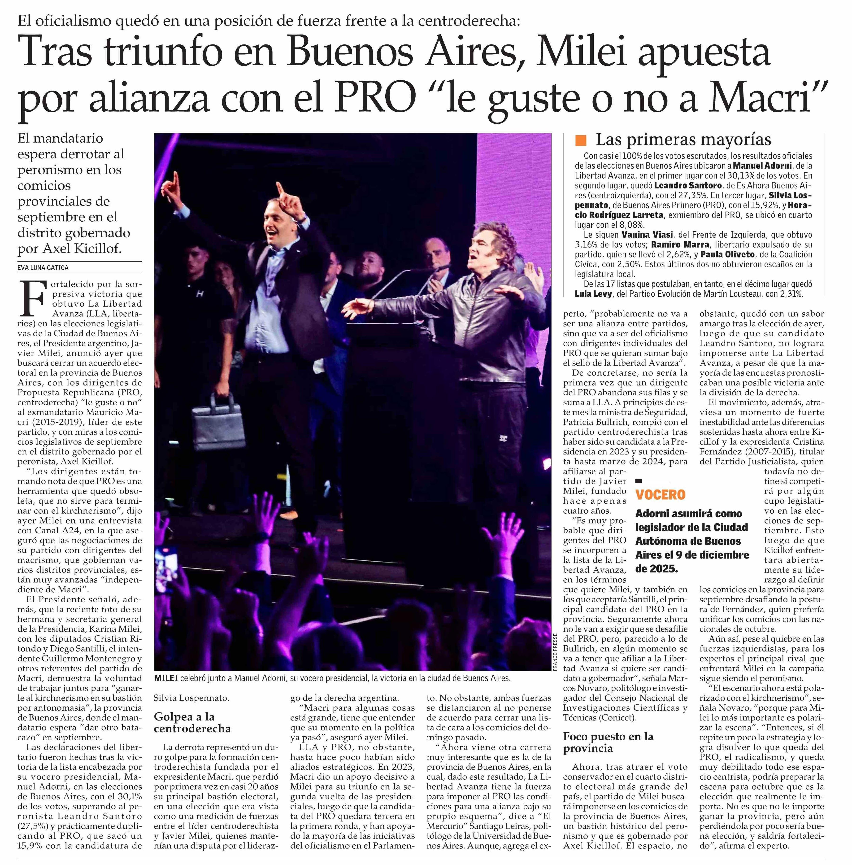 Tras triunfo en Buenos Aires, Milei apuesta por alianza con el PRO "le guste o no a Macri" 20-05-2025 El Mercurio |